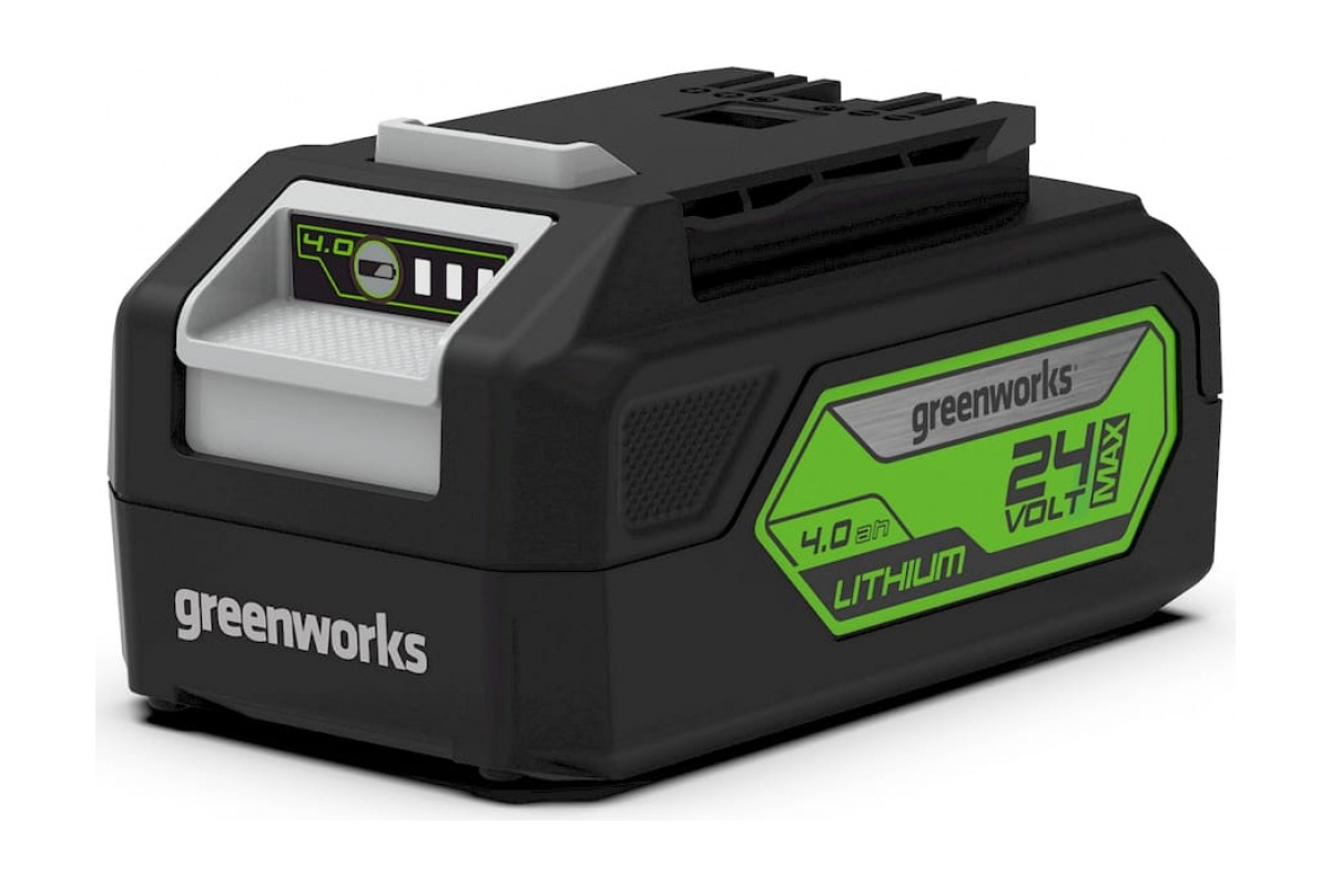 Аккумулятор GreenWorks 24 вольта (модель G24B4) - современная модель литий-ионных аккумуляторов, изготовленная по самой современной технологии. Состоит из ячеек самого высокого класса - А++. Применяется в линейке всех устройств Greenworks G-24. Данные ячейки находятся под управлением специальной платы, интеллектуальная программа которой регулирует заряд/разряд в каждой ячейке одновременно, благодаря этому увеличивается срок службы аккумулятора (до 2000 циклов заряд-разряд), время работы устройства от аккумулятора (на 20%), а главное - нет потери мощности инструмента при разряде батареи. Емкость составляет 4 А/ч. Ячейки заключены в ударопрочный корпус. Условия для идеального хранения - 40% заряда и температура выше 0 С. Зарядное устройство поставляется отдельно. Время заряда аккумулятора - 80 мин. Для контроля уровня заряда на батареи предусмотрен специальный индикатор.