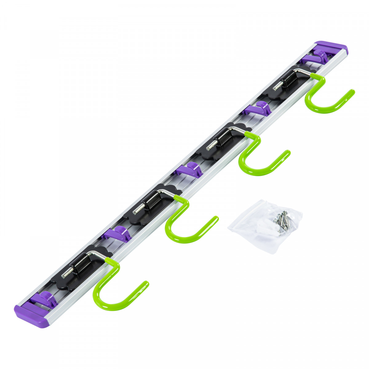 • Алюминиевый держатель выдерживает нагрузки до 15 кг, крючки — до 3 кг каждый.