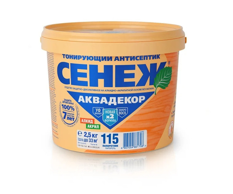 Антисептик СЕНЕЖ АКВАДЕКОР предназначен для долговременной защиты древесины от атмосферных осадков, плесневых, деревоокрашивающих и дереворазрушающих грибов, водорослей и насекомых-древоточцев, а также декоративной отделки под ценные породы. Сочетание в СЕНЕЖ АКВАДЕКОР алкидов, акрилатов и льняного масла улучшает проникновение в древесину, формирует эластичное дышащее защитное покрытие с мягким шелковистым блеском.