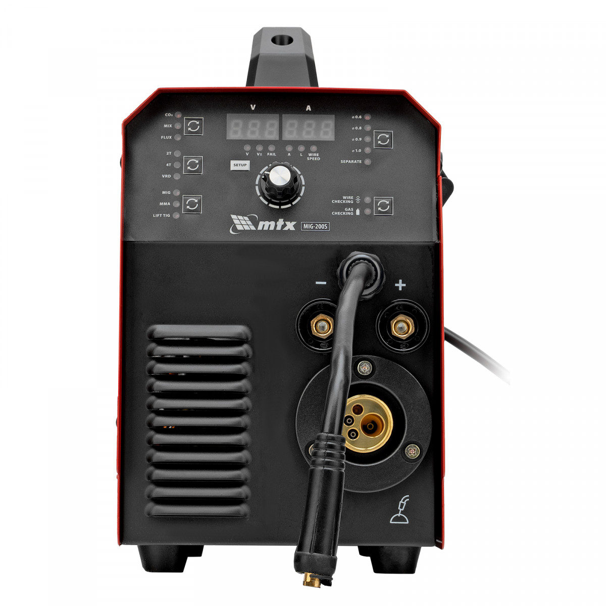 Инверторный аппарат полуавтоматической сварки MTX MIG-200S 94303, предназначенный для сварки на максимальном токе до 200 А, имеет продолжительность включения 60% и совместим с катушками весом до 5 кг. Используется для работы со сталями, черными и цветными металлами. Сварочный аппарат изготовлен с использованием передовой технологии IGBT, позволяющей получать стабильный сварочный ток на выходе. Аппарат имеет высокий КПД при низком энергопотреблении, способен работать при пониженном до 180 В напряжении.