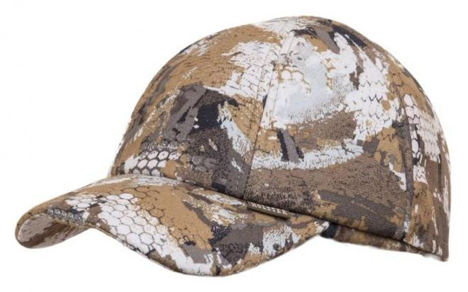Бейсболка выполнена из аловы в камуфляжной расцветке с рисунком "коричневые соты"; подкладка - из флиса. Для подгонки под нужный размер головы имеется эластичный шнур с фиксатором на затылке. Фонарик питается от двух батареек-таблеток, размещаемых в кармашке на подкладке. Выключатель фонарика находится на козырьке.