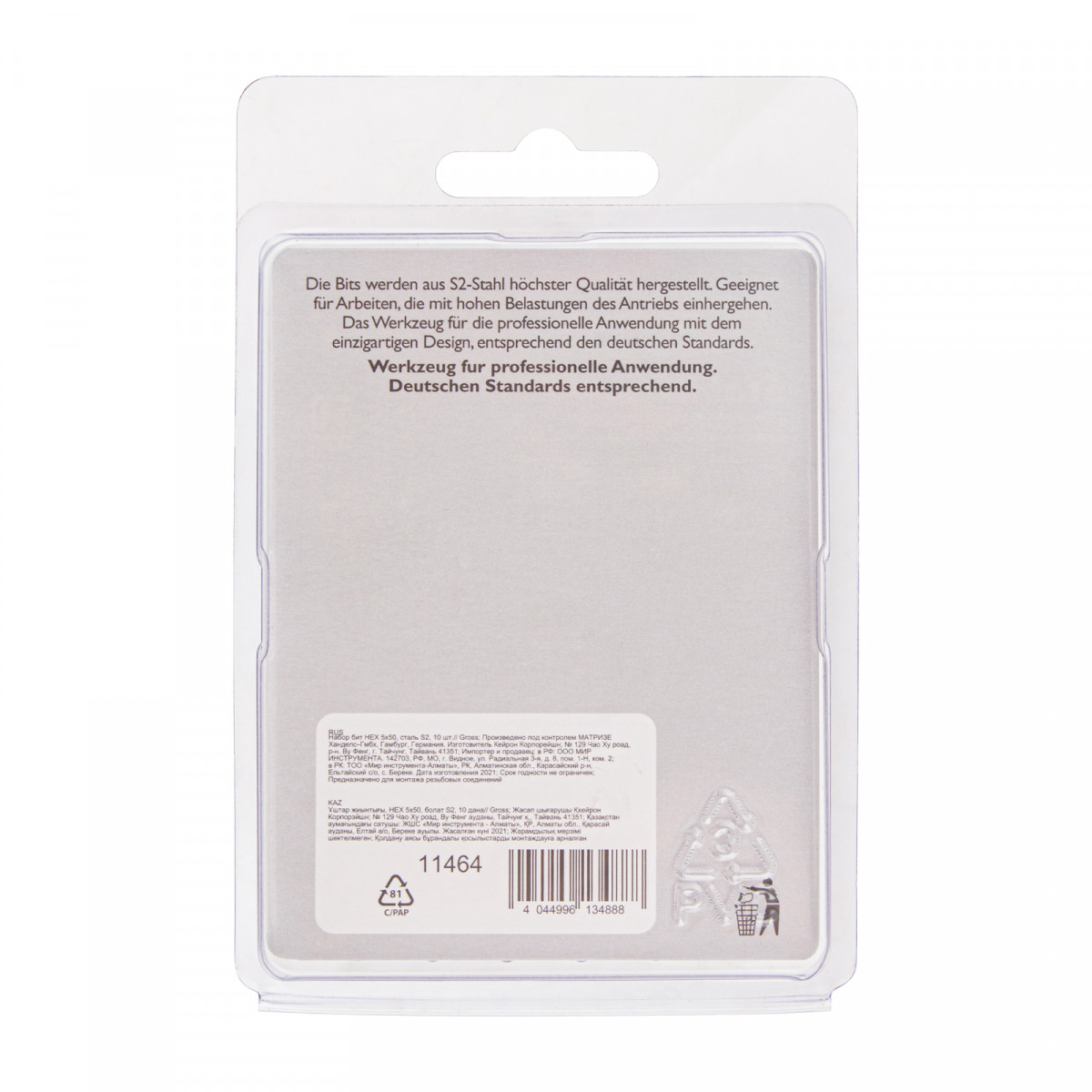 Набор бит Gross 11464 состоит из 10 сменных насадок HEX 5 х 50 мм с шестигранным хвостовиком 1/4 дюйма, изготовленных из стали S2, которые используются в качестве оснастки на шуруповертах. Биты типоразмера HEX5 предназначены для монтажа и демонтажа мебельных и велосипедных евровинтов. Шестигранный шлиц обеспечивает большую площадь соприкосновения с крепежом, что позволяет увеличить крутящий момент без риска повреждения биты.