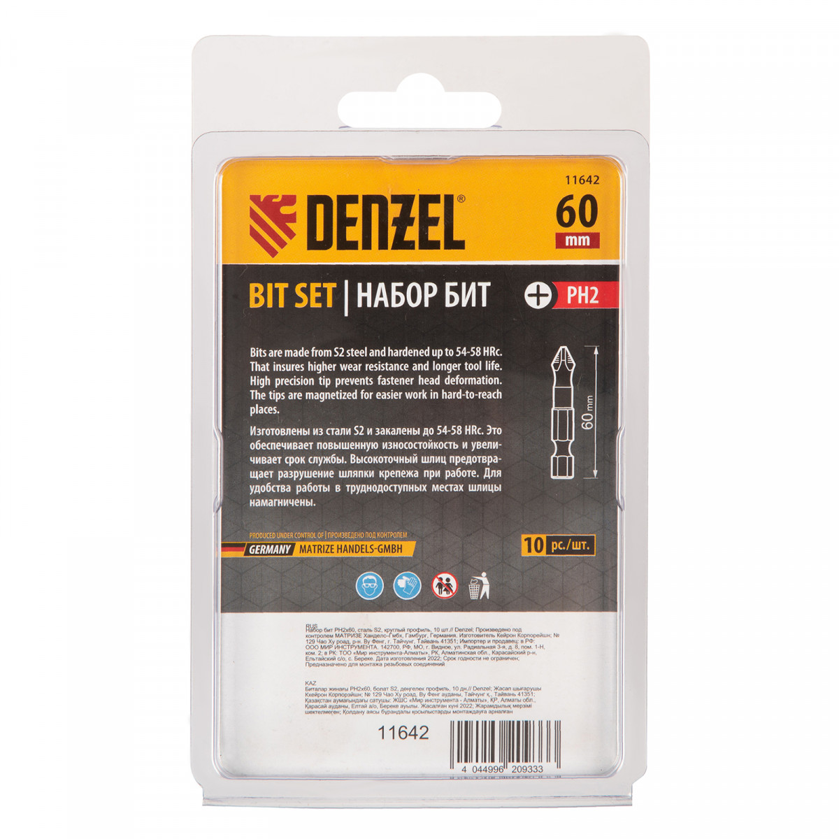 Набор бит PH2x60 Denzel 11642 состоит из 10 сменных односторонних насадок из стали S2, с круглым профилем и крестообразными шлицами, с шестигранными хвостовиками 1/4". Профессиональная оснастка рассчитана на работу с шуруповертом, обеспечивает быстрый монтаж и демонтаж резьбовых соединений с углублением PH2.