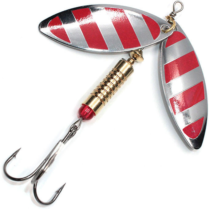 Блесна вращающаяся - это вертушка-тандем с двумя лепестками, что удваивает гидроакустический эффект и при проводке создает более сильные высокочастотные колебания, что приманивает любого хищника и делает ее более уловистей. Первый лепесток меньше второго, поэтому вихри, которые создаются за первым лепестком, не влияют на работу последнего лепестка. Лепестки имеют длинную и острую форму, которые прекрасно работают на течении и придонной ловле. Быстро замечают и атакуют такого рода приманки щука.