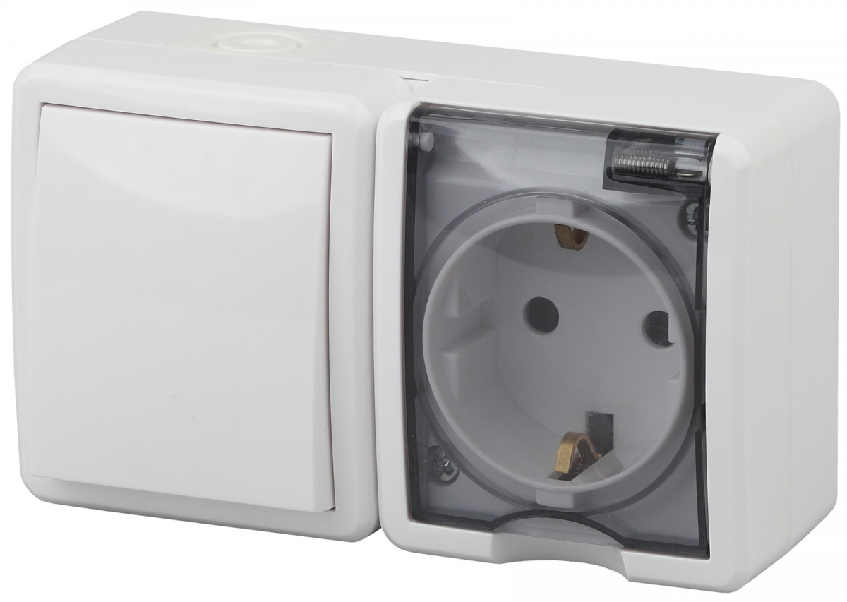 Блок ЭРА розетка+выключатель двойной IP54 16A(10AX)-250В ОУ Эра Эксперт белый 11-7402-01