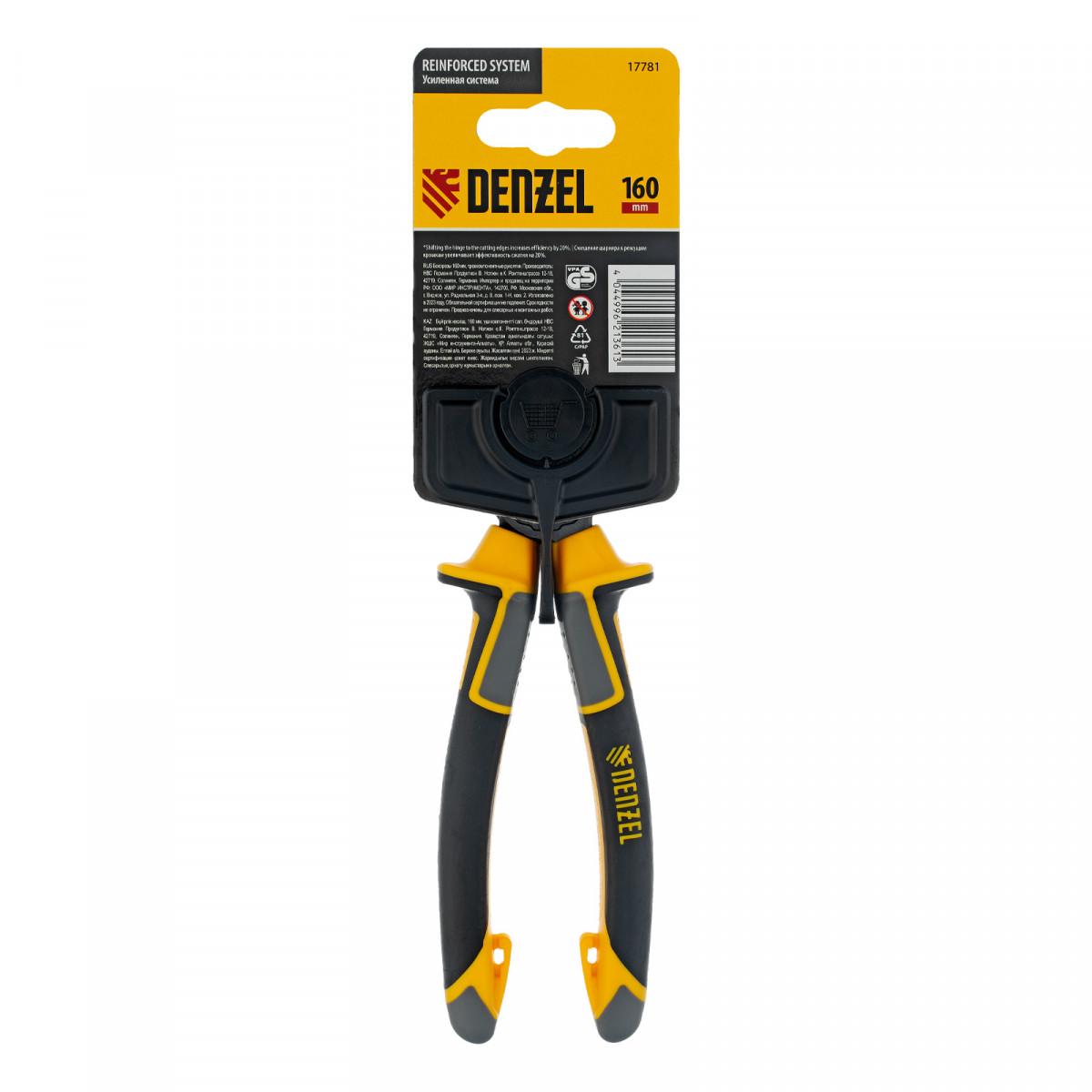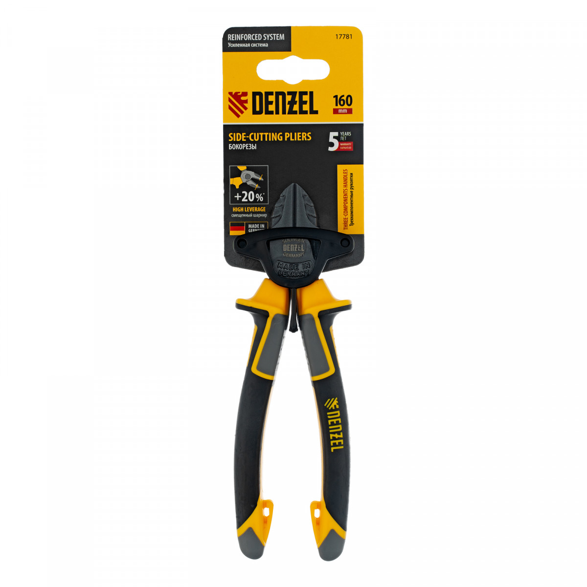 Бокорезы Denzel 17781 длиной 160 мм, с трехкомпонентными рукоятками, предназначены для разрезания кабелей из алюминия и меди, а также проволоки и стяжек. Максимальный диаметр перерезаемой мягкой проволоки (алюминиевой, медной, с пределом прочности 220 Н/мм2) составляет 6 мм, проволоки средней жесткости и гвоздей (750 Н/мм2) — 3,5 мм, жесткой (1800 Н/мм2) — 2 мм. Бокорезы используются для проведения слесарных и монтажных работ. Шарнир смещен к режущим кромкам, что позволяет сэкономить 20% усилий и максимально эффективно решать поставленные задачи.