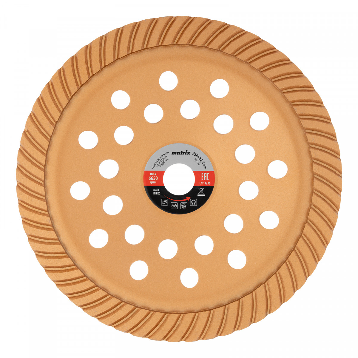 Алмазная зачистная чашка Matrix Turbo 72992 диаметром 230 мм устанавливается на вал углошлифовальной машины, для чего предусмотрено посадочное отверстие 22,2 мм. Используется для придания окончательной гладкости бетонным, каменным, мраморным, гранитным и кирпичным поверхностям, а также для снятия фаски на плитах из гранита или мрамора. Предназначена для профессионального применения.