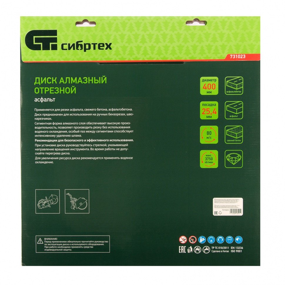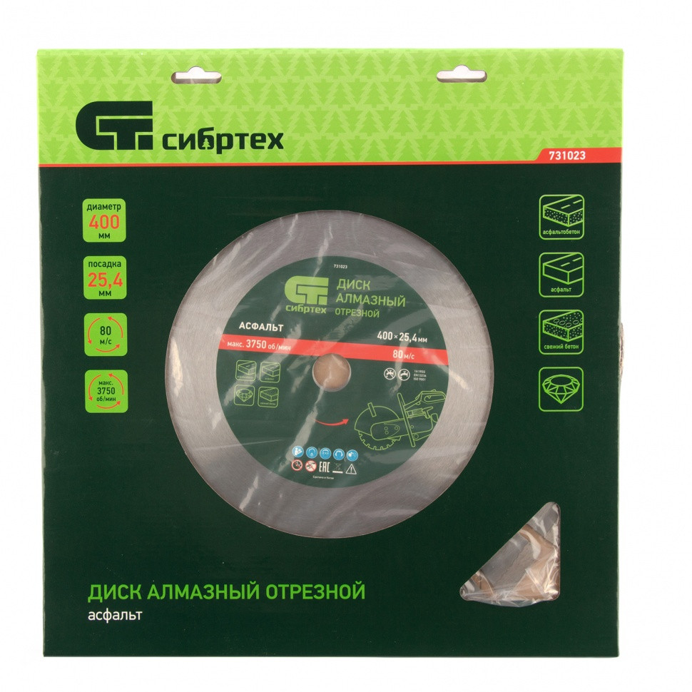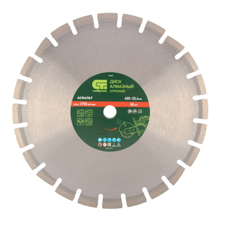 Алмазный диск Сибртех «Асфальт» 731023 диаметром 400 х 25,4 мм используется для сухого и мокрого реза асфальта, свежего бетона, асфальтобетона, камня, кирпича, абразивных материалов. Устанавливается на ручной бензорез или швонарезчик с посадочным диаметром 25,4 мм. Диск устойчив к деформациям и выдерживает значительные нагрузки. Для увеличения ресурса диска рекомендуется проводить мокрое резание.