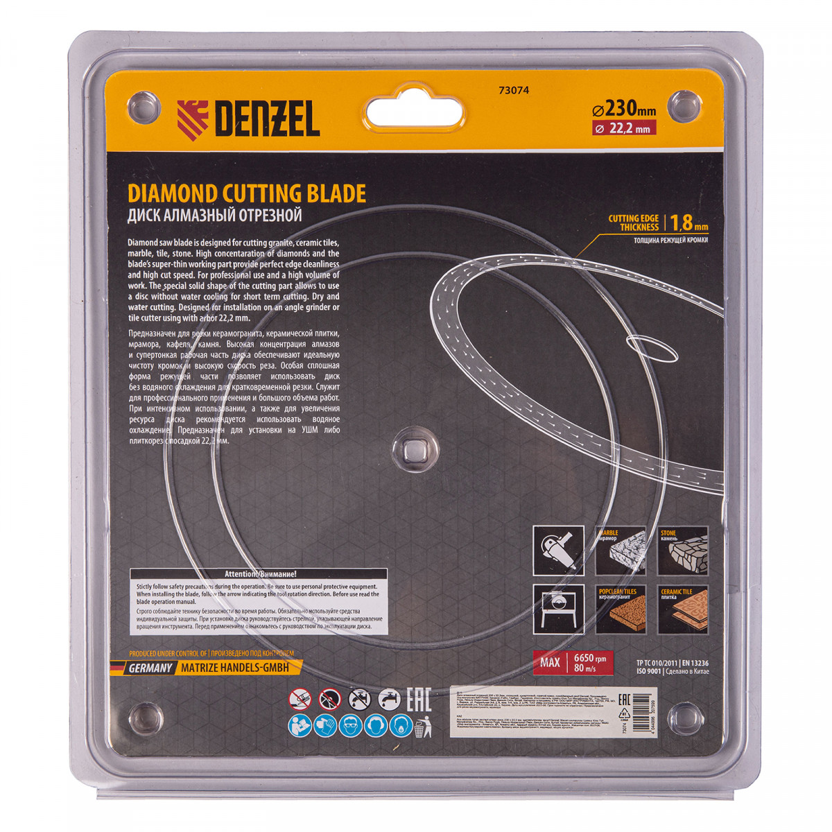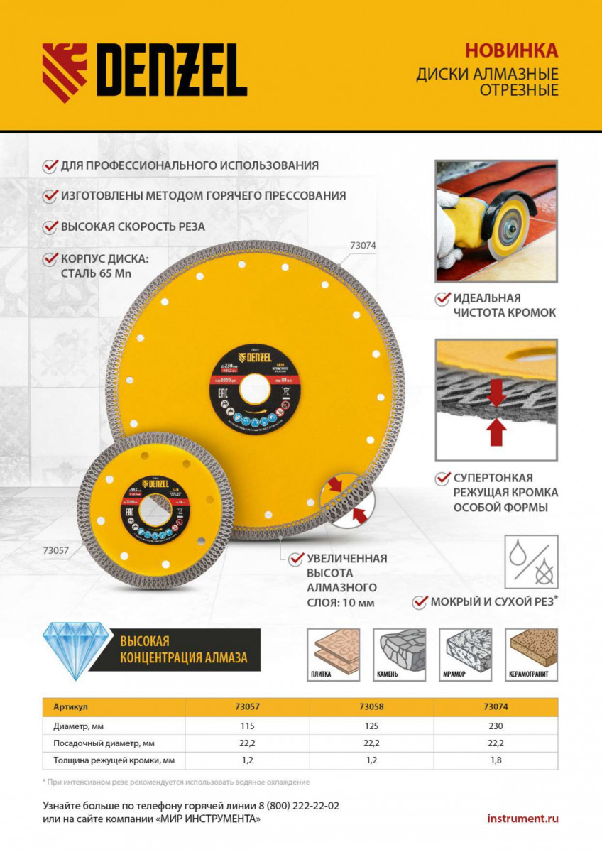 Алмазный диск ТМ Denzel "Сплошной" арт 73074, ф230 х 22,2 мм, предназначен для резания мрамора, керамогранита и керамическую плитки, камня. Устанавливается на УШМ (болгарку) или плиткорез с посадочным диаметром 22,2 мм. Высокая концентрация алмазов и супертонкая рабочая часть диска обеспечивает идеальную частоту кромок и высокую скорость реза.Особая сплошная форма режущей части позволяет использовать диск без водяного охлаждения для кратковременного реза.Диск произведен по технологии горячего прессования с увеличенной шириной режущей кромки (10мм) подходит для профессионального использования и больших объемов работ. При интенсивной резке необходимо использовать водяное охлаждение.