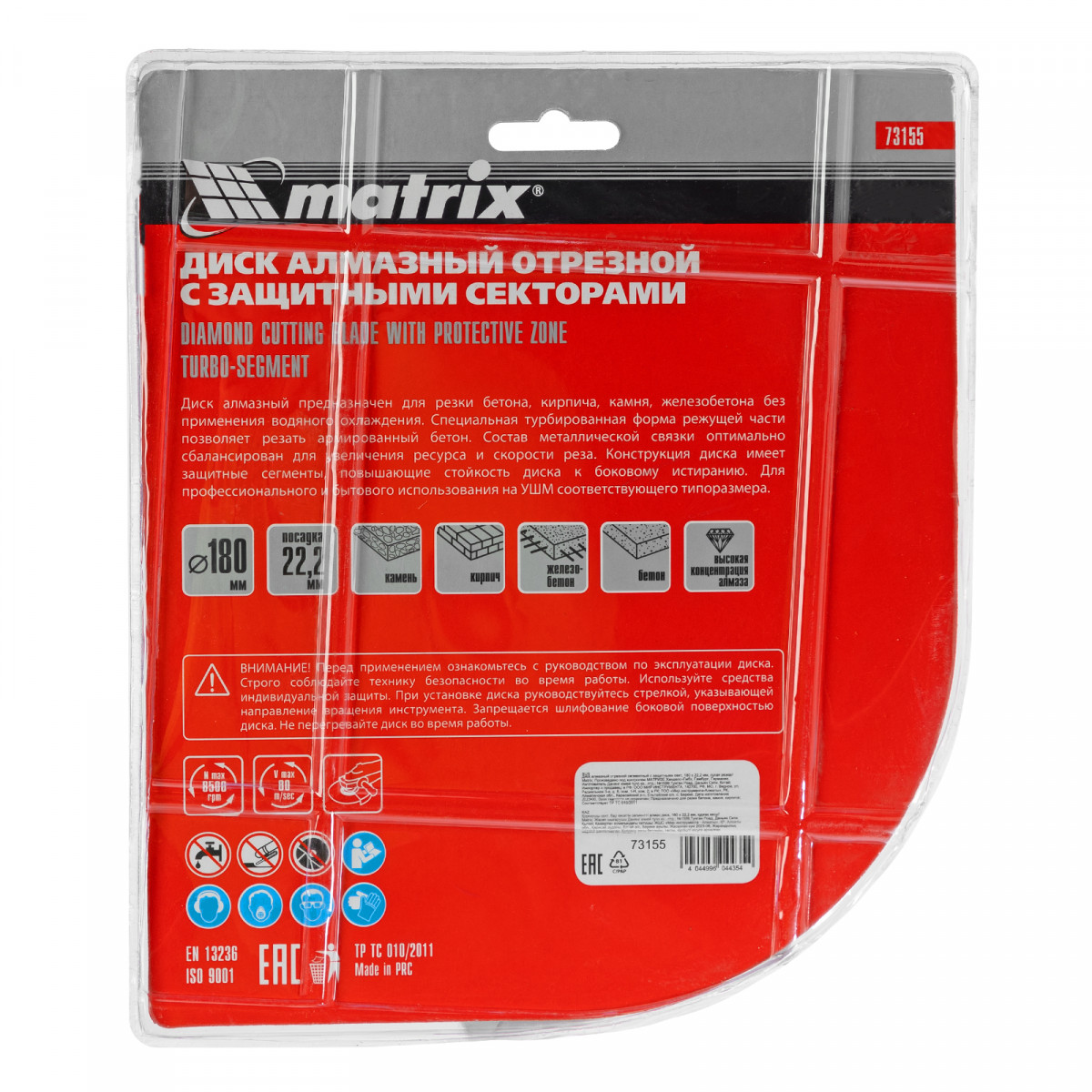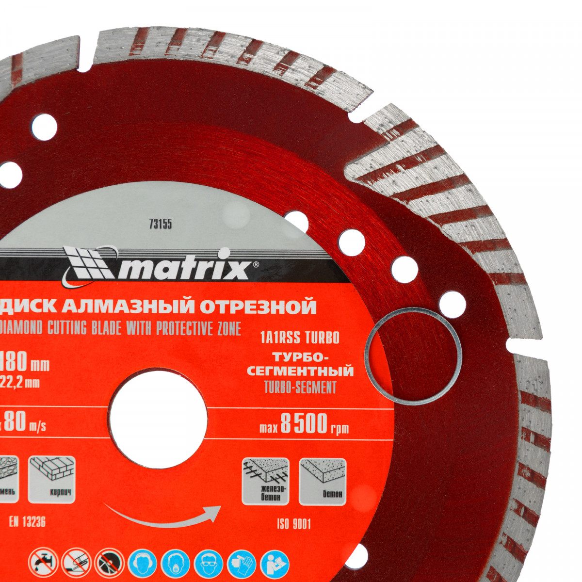 Алмазный отрезной сегментный диск Matrix 73155 с защитными секторами, диаметром 180 х 22,2 мм, применяется для сухой резки бетона разной прочности, камня, кирпича, шлакоблока и тротуарной плитки. Используется как оснастка для углошлифовальных машин с соответствующим посадочным диаметром. Диск изготовлен методом холодного прессования и выдерживает повышенные нагрузки при прохождении арматуры в слабоармированном железобетоне.