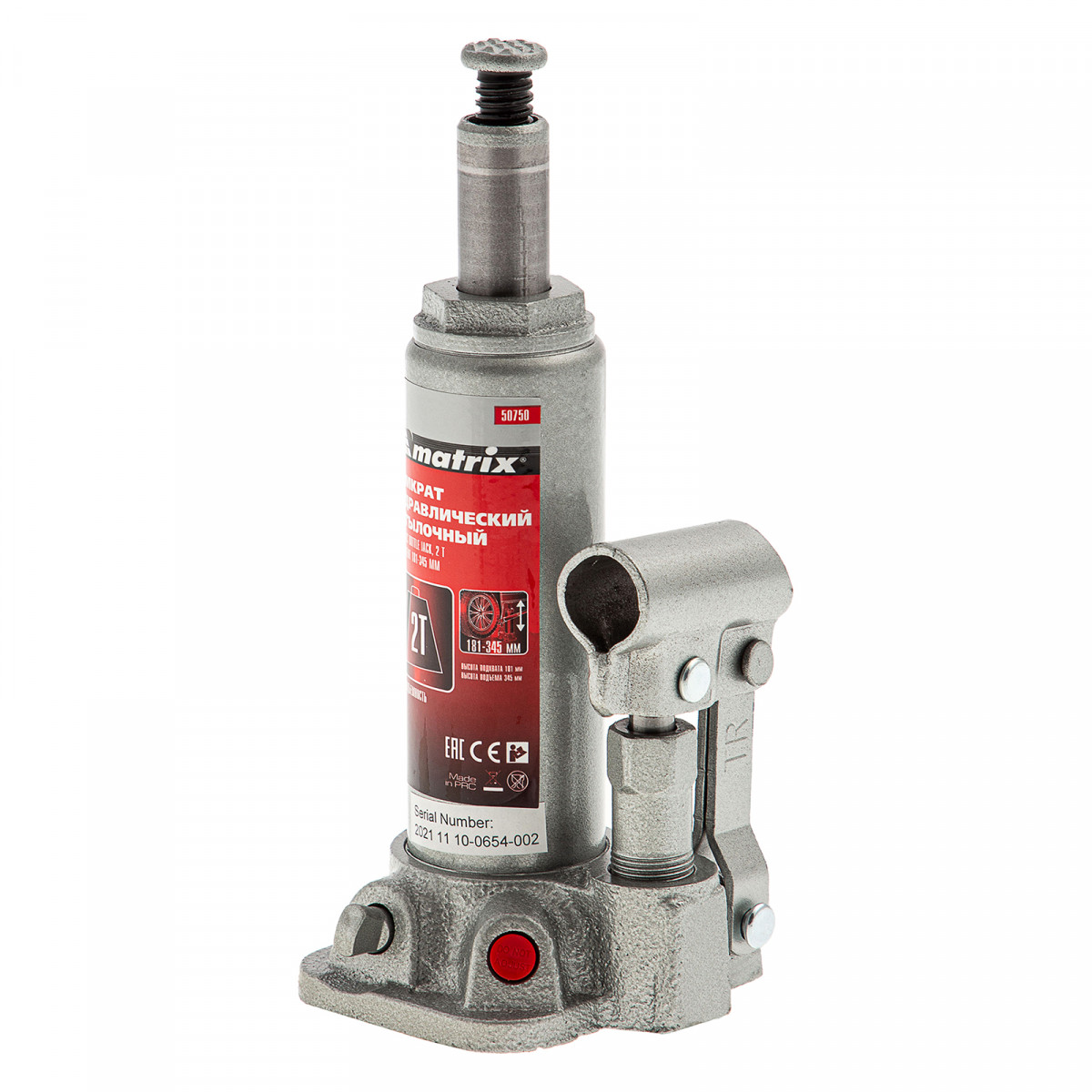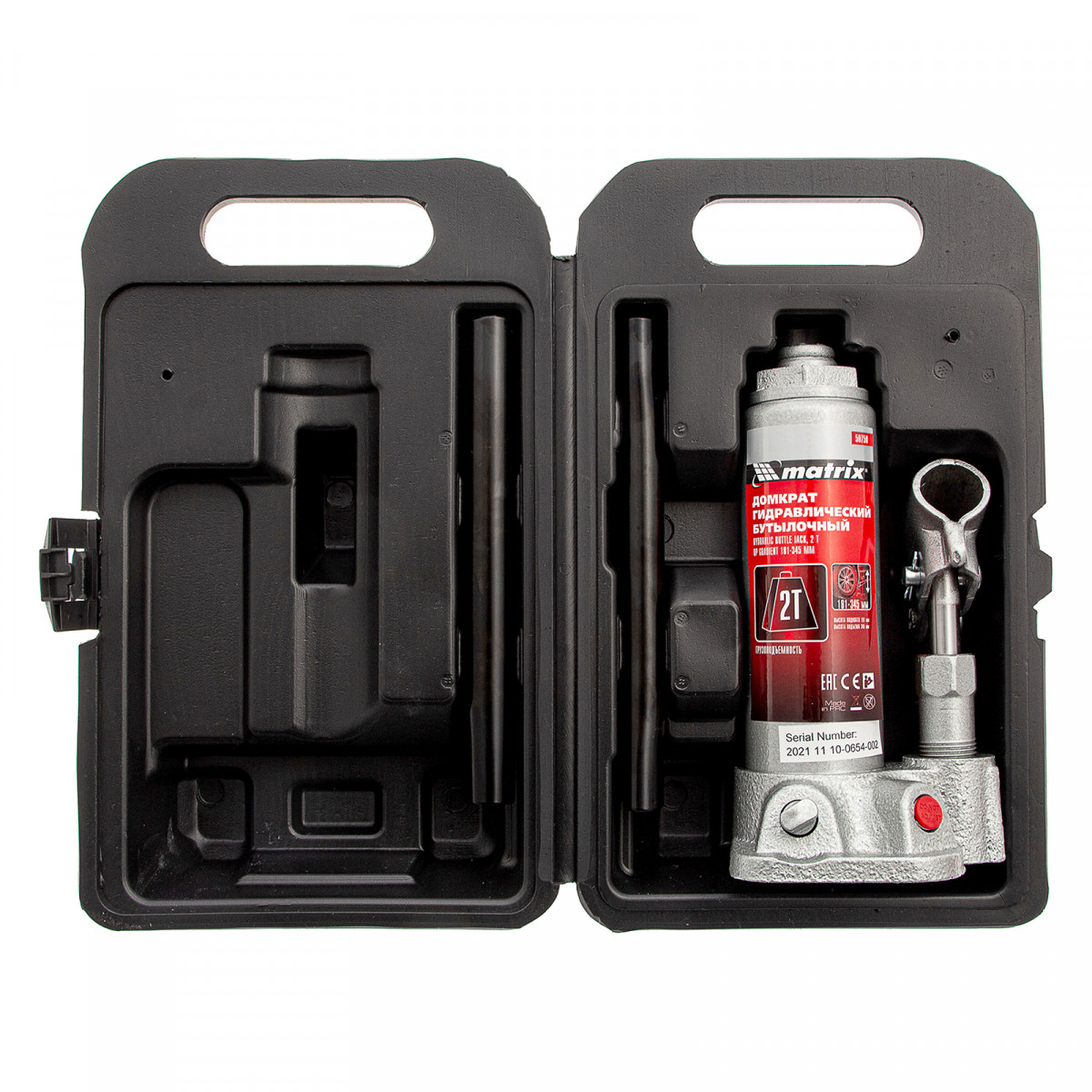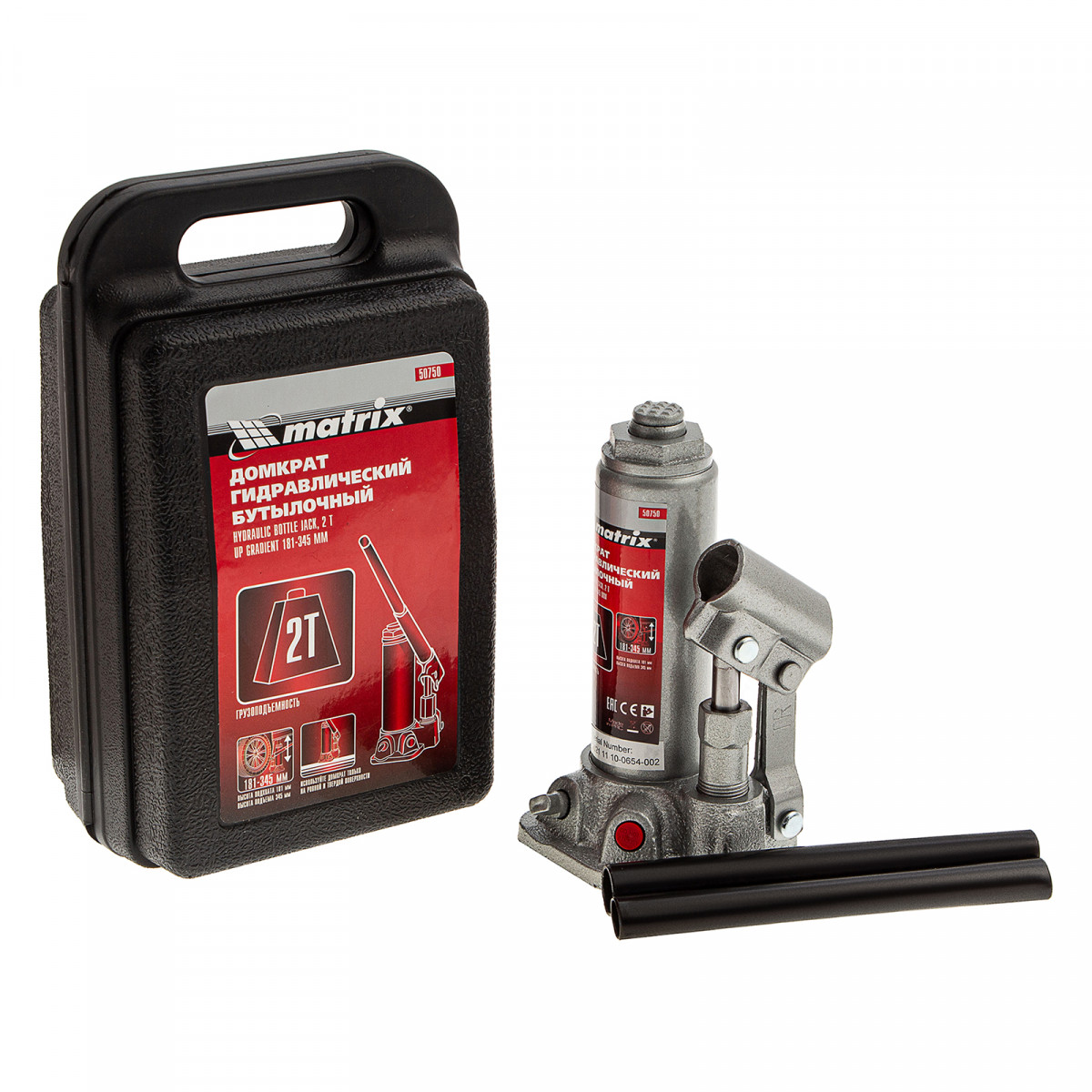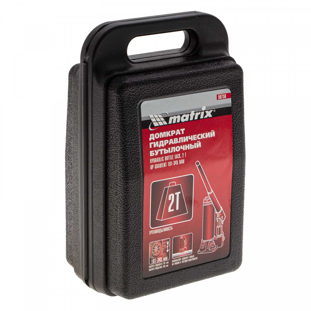 Домкрат гидравлический бутылочный, 2 т, высота подъема 181-345 мм, в пластиковый кейсе Matrix