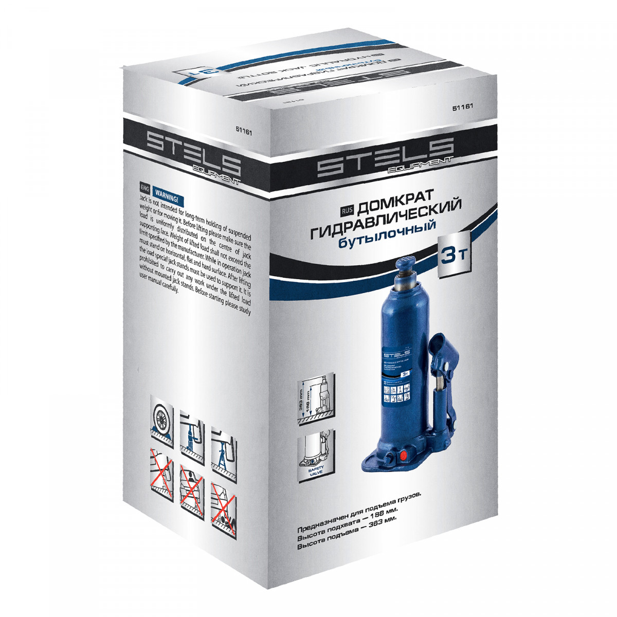 Гидравлический бутылочный домкрат Stels 51161 применяется для быстрого поднятия грузов весом до 3 т на высоту 188-363 мм. Оптимален для автомобилей с большим клиренсом. Домкрат будет полезен автолюбителям и профессионалам для ремонта транспортного средства.