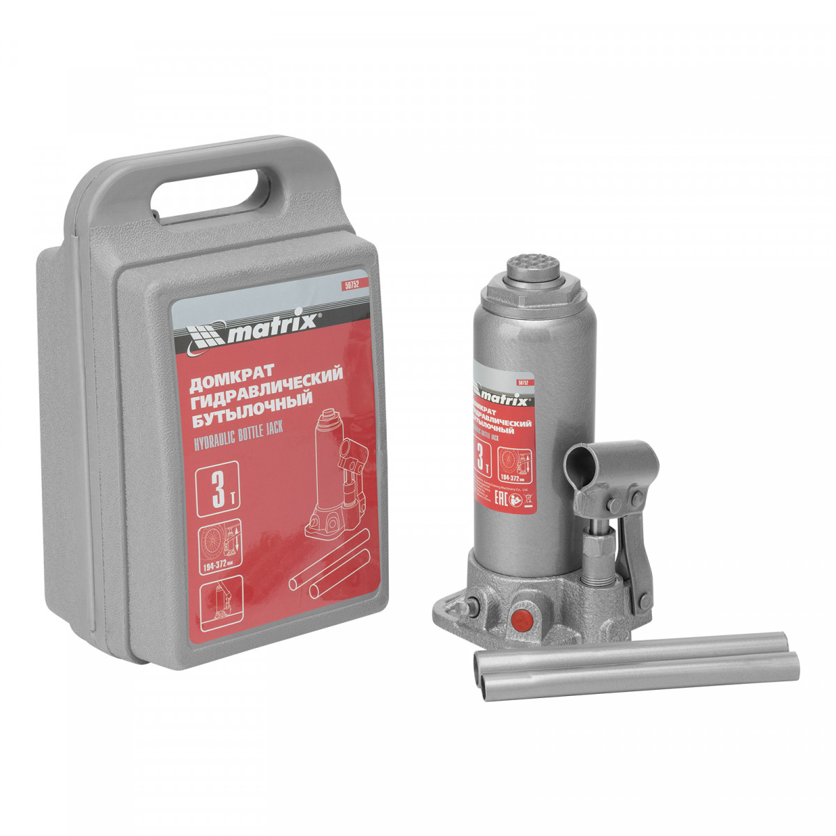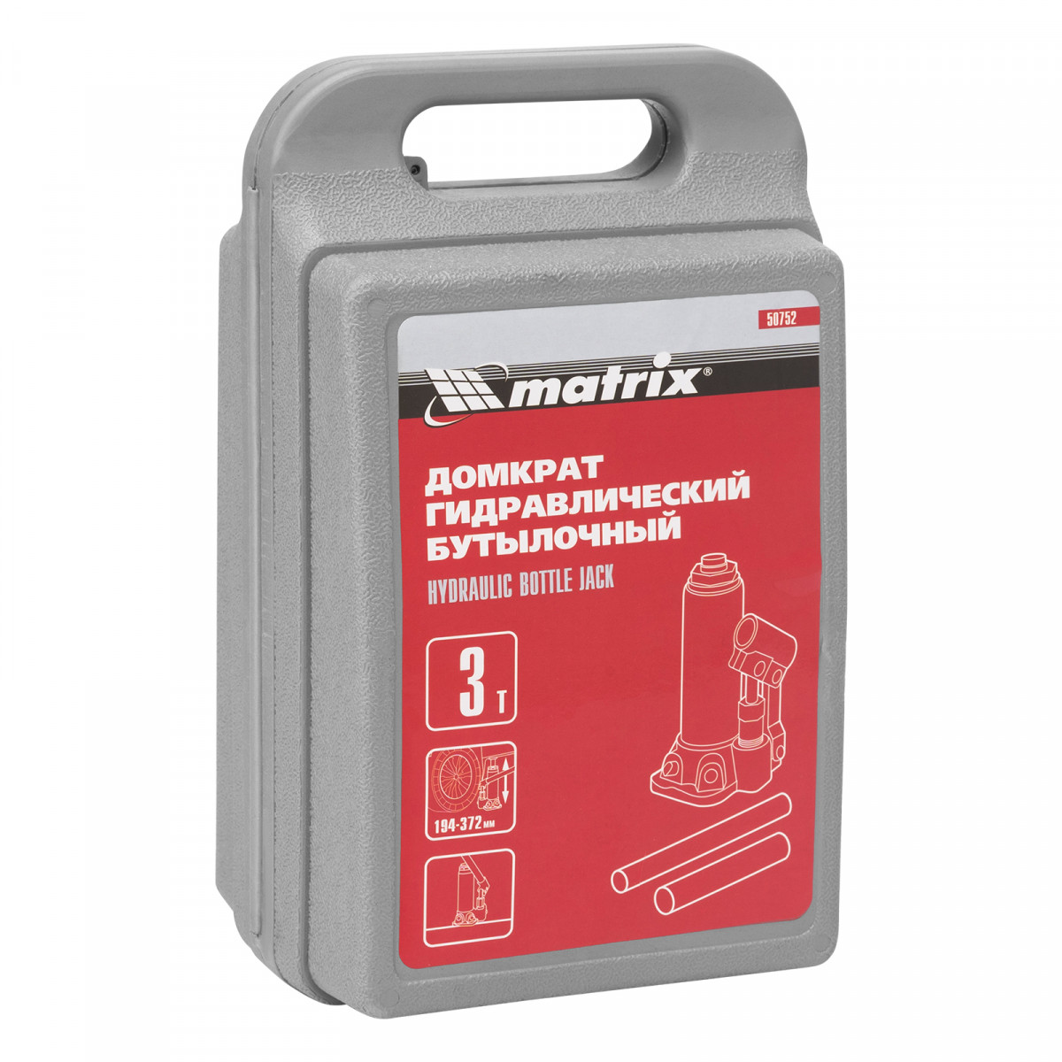 Домкрат гидравлический бутылочный, 3 т, высота подъема 194-372 мм, в пластиковый кейсе Matrix