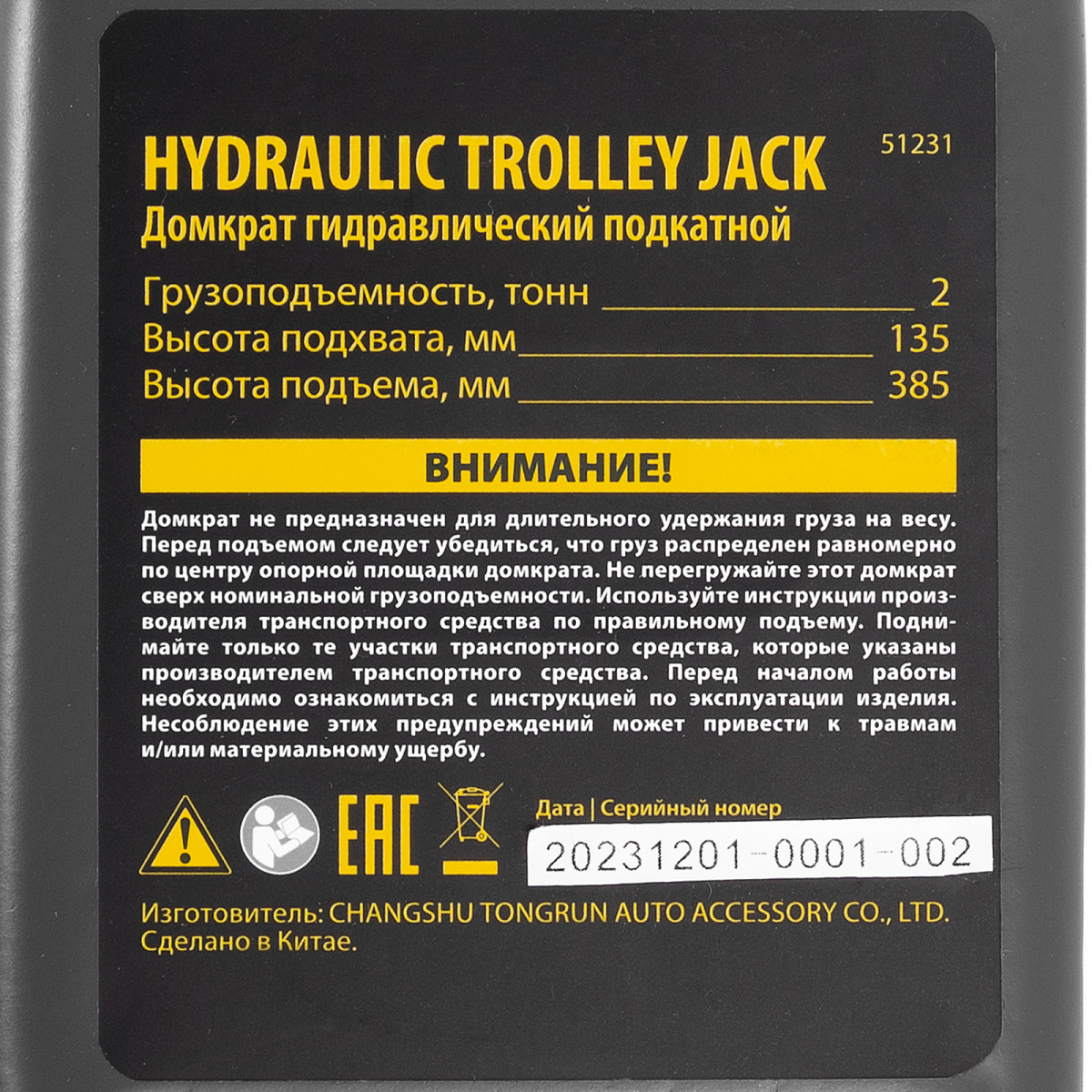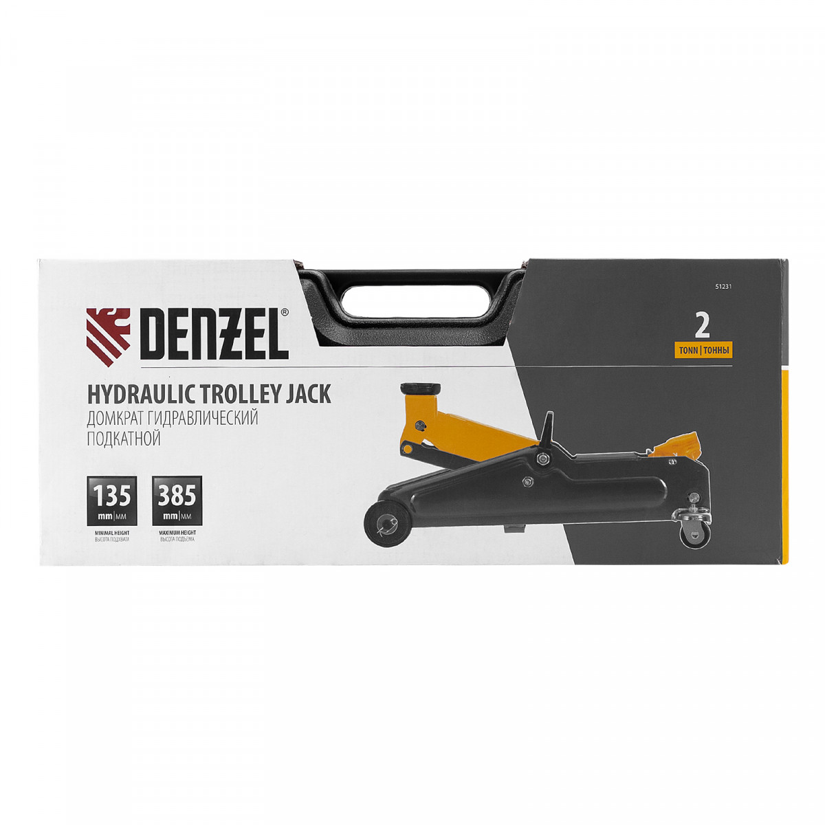 Гидравлический подкатной домкрат Denzel 51231 с высотой подхвата 135 мм, поставляющийся в пластиковом кейсе, предназначен для плавного подъема грузов массой до 2 т на высоту до 385 мм. Домкрат пригодится владельцам легковых автомобилей со стандартным клиренсом.