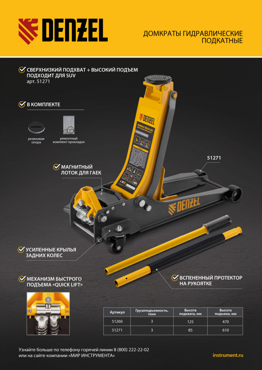 Профессиональный подкатной гидравлический домкрат Denzel 51271 с низким подхватом используется для быстрого подъема на высоту 85-610 мм всех типов автомобилей с любым клиренсом и массой до 3 т, в том числе SUV. В гидравлическом блоке предусмотрено 2 насоса (система быстрого подъема QUICK LIFT), благодаря чему для достижения предельной высоты достаточно 6 качков рукоятки. Домкрат подходит для использования на станциях техобслуживания и шиномонтажа.