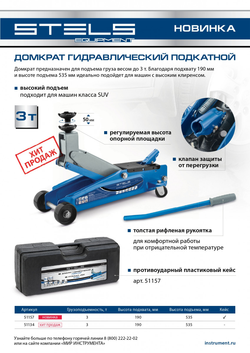 Подкатной гидравлический домкрат Stels 51134 с высоким подъемом 190 мм позволяет поднимать грузы весом до 3 т на высоту 535 мм и подходит для автомобилей класса SUV с увеличенным дорожным просветом. Может использоваться для самостоятельного обслуживания авто.