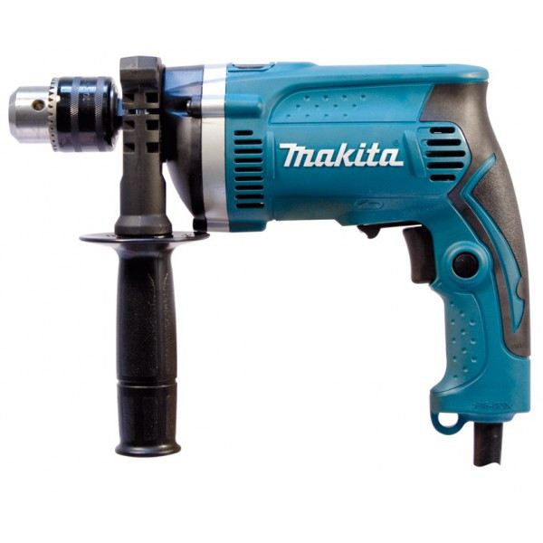 Ударная дрель Makita HP1630 оснащена ключевым патроном, что гарантирует надёжное закрепление оснастки. Имеется два рабочих режима: сверление с ударом и без. Переключение между ними осуществляется посредством тумблера сверху на корпусе. Сбоку на корпусе расположен фиксатор клавиши "Пуск" для удобства ведения длительной по времени работы. Дополнительная рукоятка обеспечивает надежный хват инструмента обеими руками.