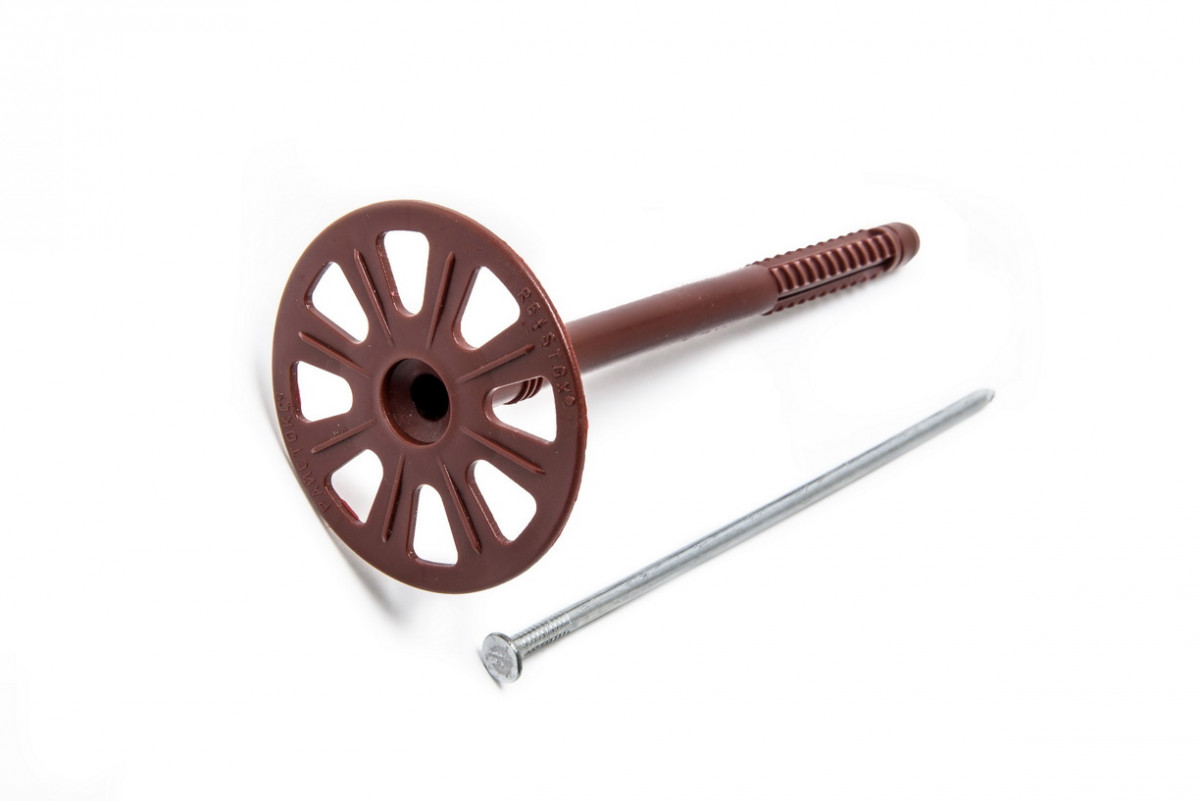 Тарельчатый забивной дюбель c пластмассовым или стальным гвоздём, применяемый в качестве механического крепежа теплоизоляции в различных конструктивных решениях фасадных систем: вентилируемых и т. н. «мокрых» фасадах необходим для надежного, механического крепления изоляционных слоев, подверженных большим нагрузкам на сдвиг. Неправильный выбор крепежа может привести к серьезным последствиям: отслоению изоляционных плит, смещению изоляции, появлению трещин на фасаде и даже отрыву изоляции вместе с штукатурным слоем, в процессе эксплуатации. Тарельчатый дюбель (грибок ) - предназначен для крепления различных видов мягких и жестких материалов для теплоизоляции - это могут быть плиты минеральная вата, стекловата, полистирол, пенопласт и другие теплоизоляционные и звукопоглощающие материалы. Диаметр шляпки грибков для минваты составляет стандартный размер – 59 мм. Основной материал, из которого производятся грибки, является ударопрочный полипропилен или полиэтилен низкого давления.
