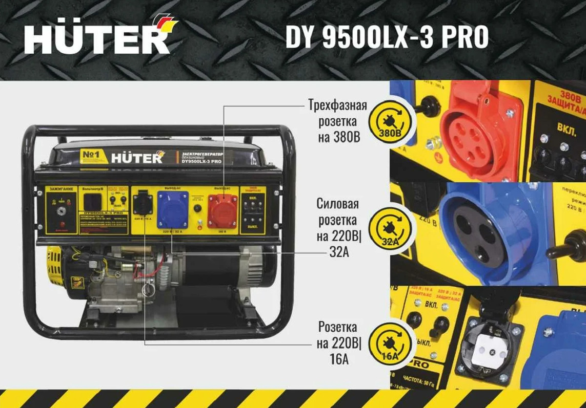 Электрогенератор Huter DY9500LX-3 PRO-электростартер 380В/220В 64/1/77 – портативная компактная электростанция, обеспечивающая электроснабжение бытовой техники и профессионального оборудования, питающегося от стандартной сети 220, а также 380 Вольт. Это самый выгодный бензиновый электрогенератор, с оптимальными техническими характеристиками и низким расходом топлива.