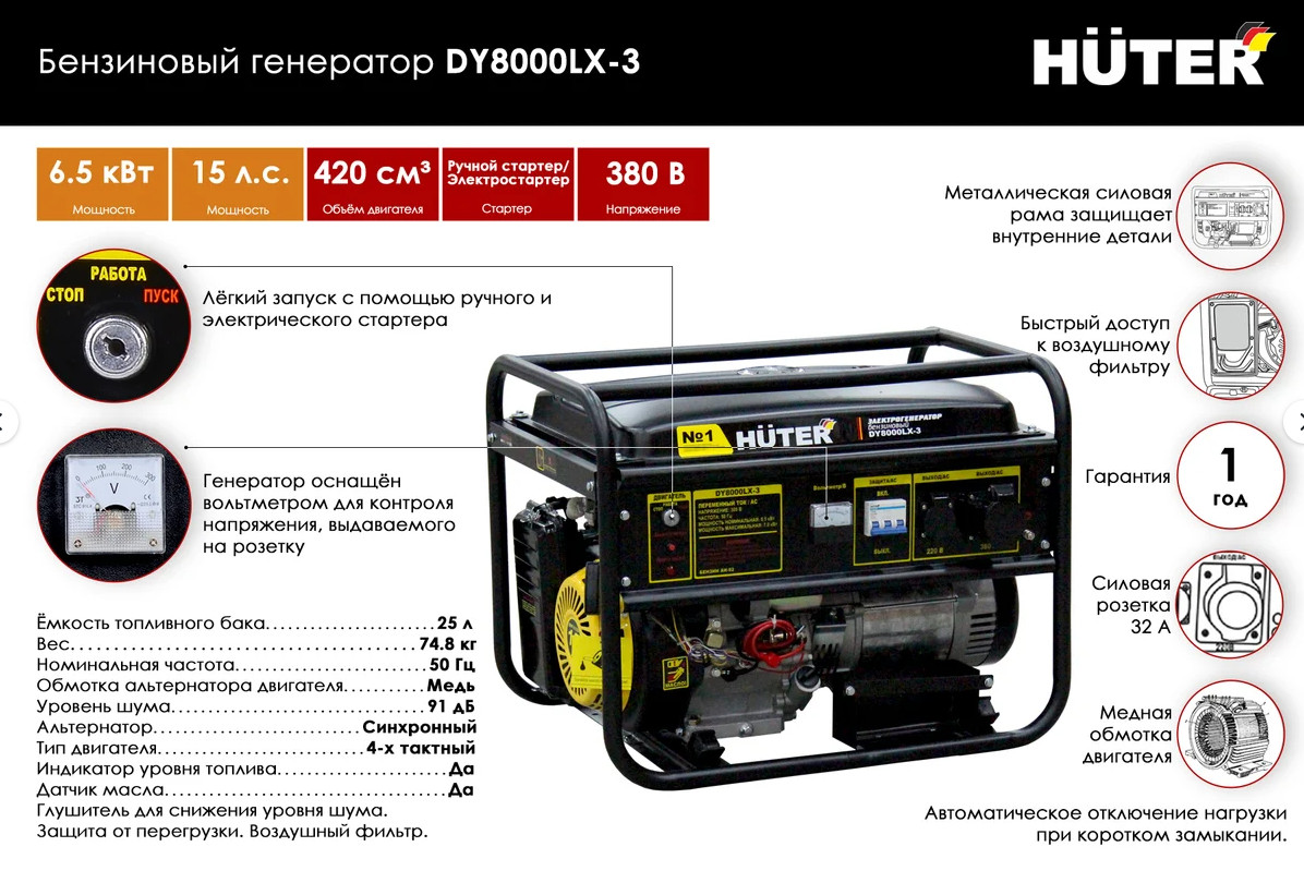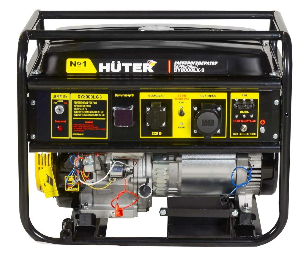 Бензиновый электрогенератор HUTER DY8000LX-3 номинальной мощностью 6500 Вт с ручным стартером предназначен для обеспечения питания приборов и аппаратуры на удаленных рабочих объектах, в загородных домах, где отсутствует или часто отключается электроснабжение.