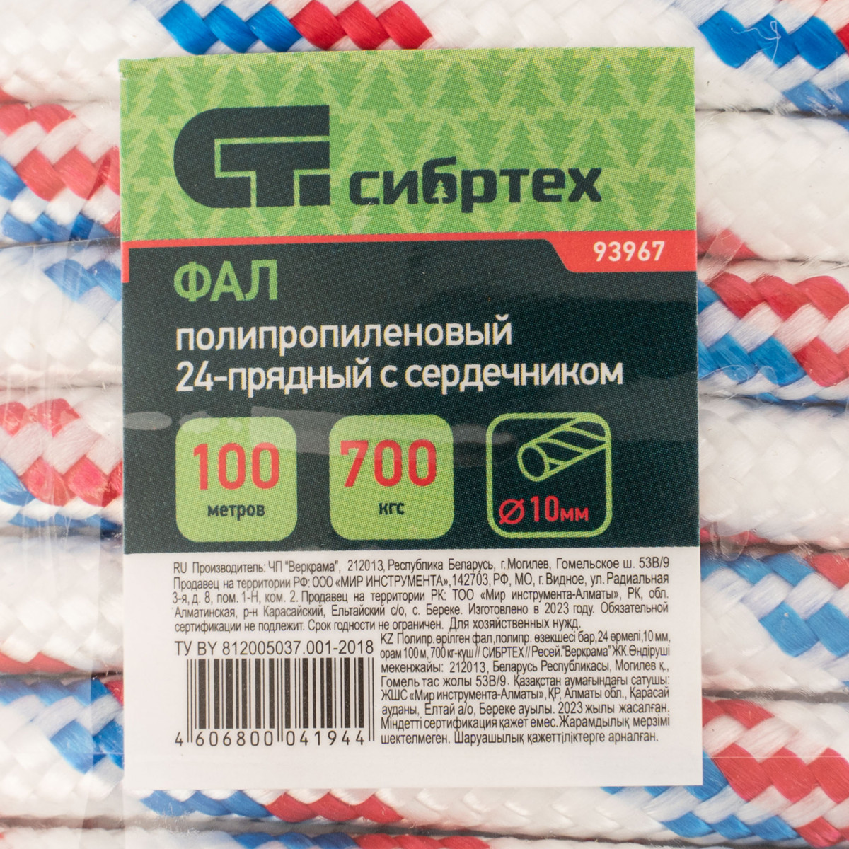 Фал плетёный полипропиленовый с сердечником, 10 мм, L 100 м, 24-прядный, Сибртех