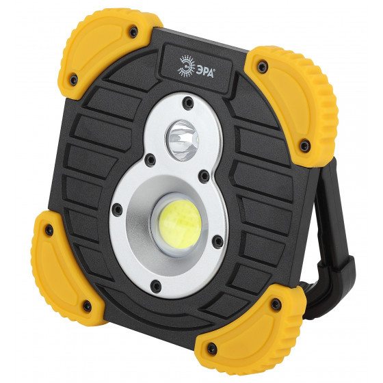 Фонарь прожектор мощностью 10 Вт от бренда ЭРА – идеальный выбор для тех, кому нужно всё и сразу! Светодиодный фонарь имеет размеры 15,5х15,5. Это экономит пространство и без труда позволяет брать фонарик в путешествие или на работу. Надежность походного светильника обусловлена корпусом из ударопрочного пластика с прорезиненными вставками по бокам. Дальность луча в 210 м подарит Вам качественное яркое освещение. Направленный свет достигается за счет COB светодиода, а заливной широкий – с помощью LED платы. 2 режима работы позволят настраивать свечение на свой вкус. Главное преимущество фонарика – 25 часов непрерывной работы. Более того, модель имеет USB гнезда для подзарядки не только самого устройства, но и мобильных телефонов. Аккумуляторный фонарь имеет подвижную ручку. Это позволяет носить устройство с собой либо использовать в качестве подвесного светильника.