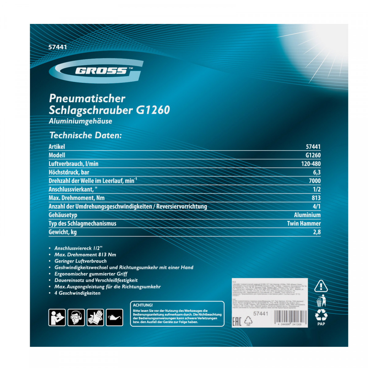 Гайковерт пневматический ударный G1260,1/2, Twin Hammer, 813Нм, 7000 об/мин Gross