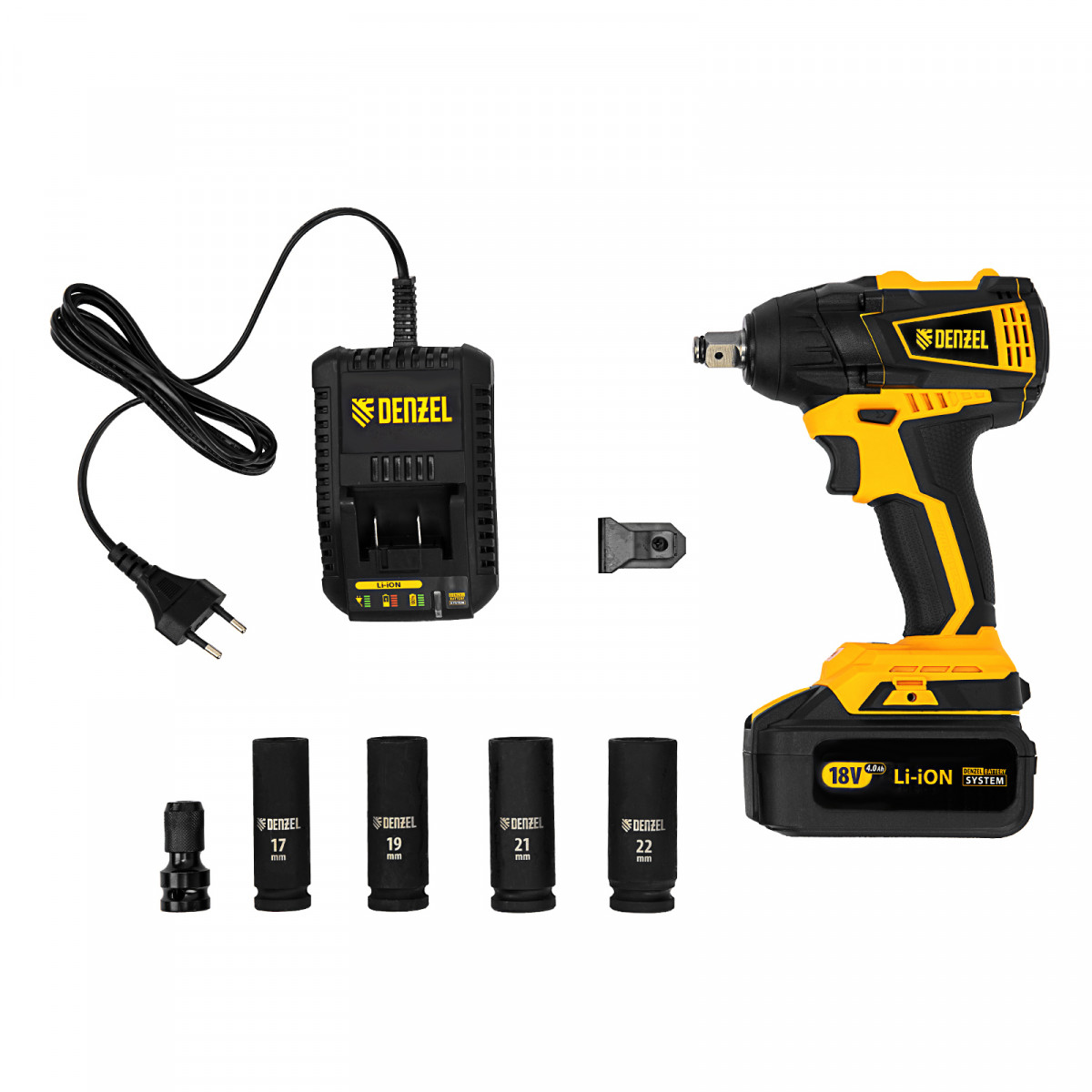 • Полная готовность к работе — в комплект входит зарядное устройство, аккумулятор, адаптер HEX 1/4 дюйма и 4 ударные торцевые головки размером 17, 19, 21 и 22 мм.