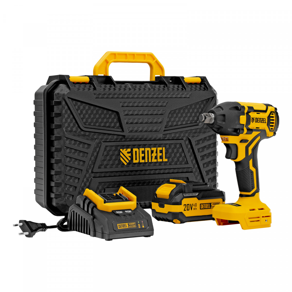 - Универсальность — аккумулятор Li-Ion емкостью 4 А·ч совместим со всеми инструментами единой платформы Denzel Power System 20V.