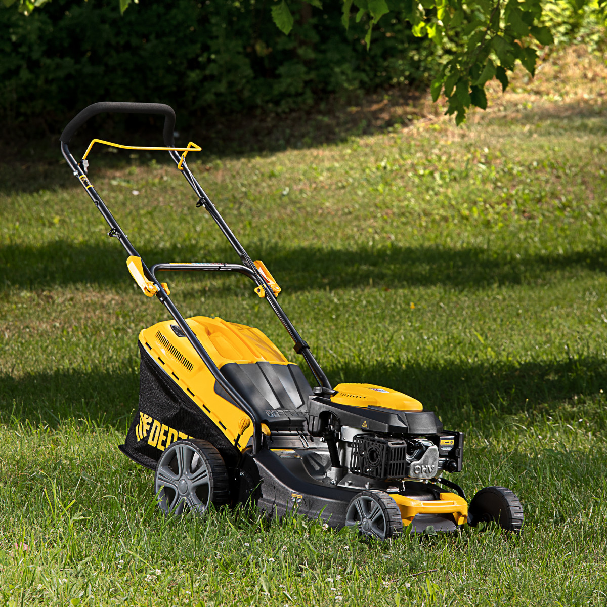 - Качественные комплектующие — хромированный цилиндр, закаленный коленвал, облегченный поршень и свеча зажигания BOSCH/NGK значительно повышают надежность газонокосилки.