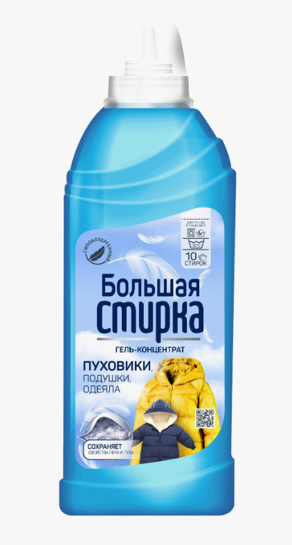 Гель для изделий из Мембранных тканей и Пуховиков, 500 мл. Гипоаллергенный гель «Большая стирка» - это уникальное средство, которое идеально подходит для эффективной и бережной стирки вещей с пуховым и синтетическим наполнителем (комбинезоны, пуховики, мембранные ткани, одеяла и подушки). Благодаря инновационной формуле и жидкой текстуре, этот гель обладает не только очищающими свойствами, но и выполняет функцию смягчения, ароматизации и защиты тканей, обеспечивает полностью безупречный результат, не оставляя следов или разводов на вашей одежде.
