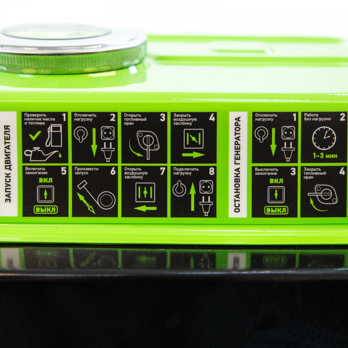 • Контроль рабочих параметров — встроенный вольтметр позволяет отслеживать напряжение в сети, а топливный индикатор — уровень бензина в баке.