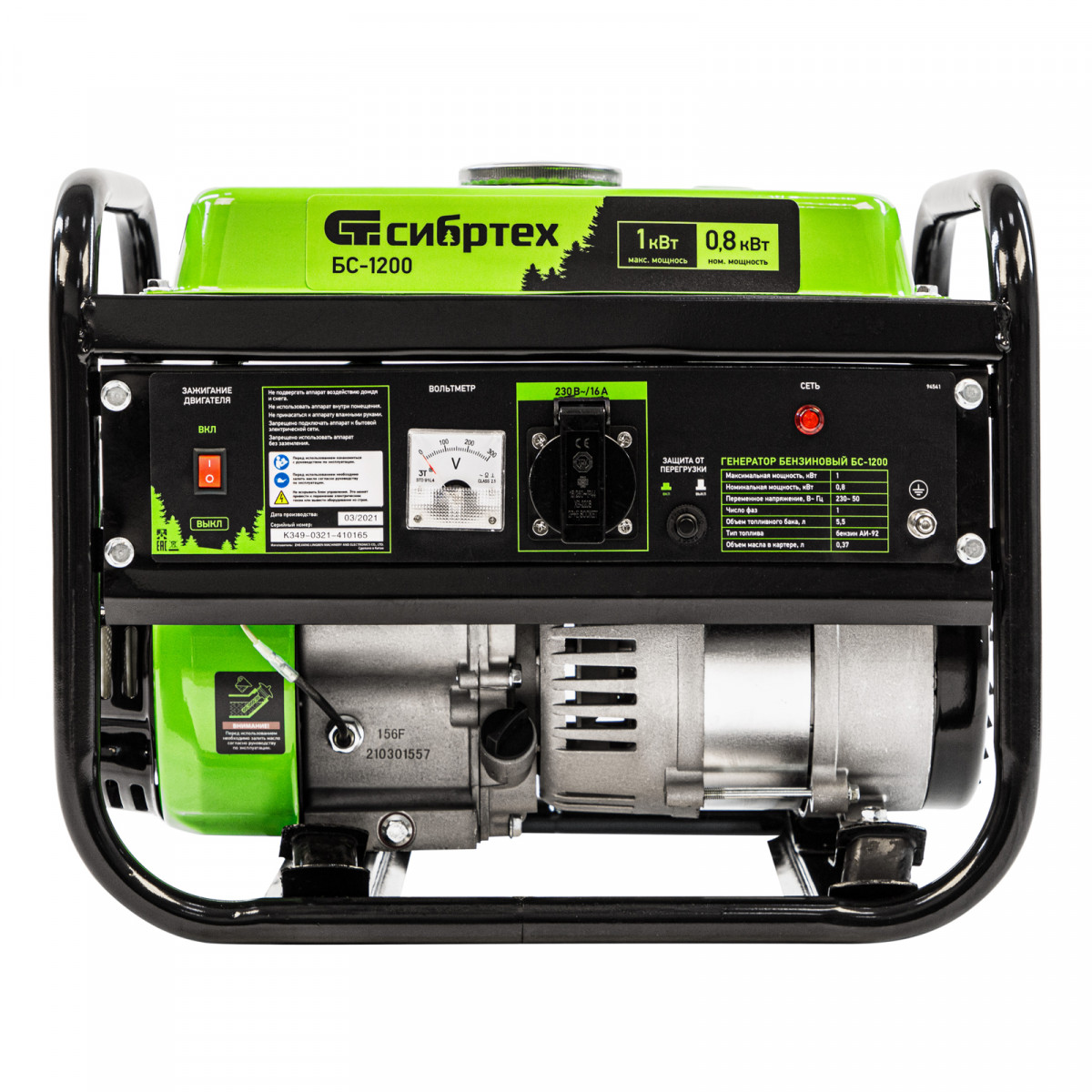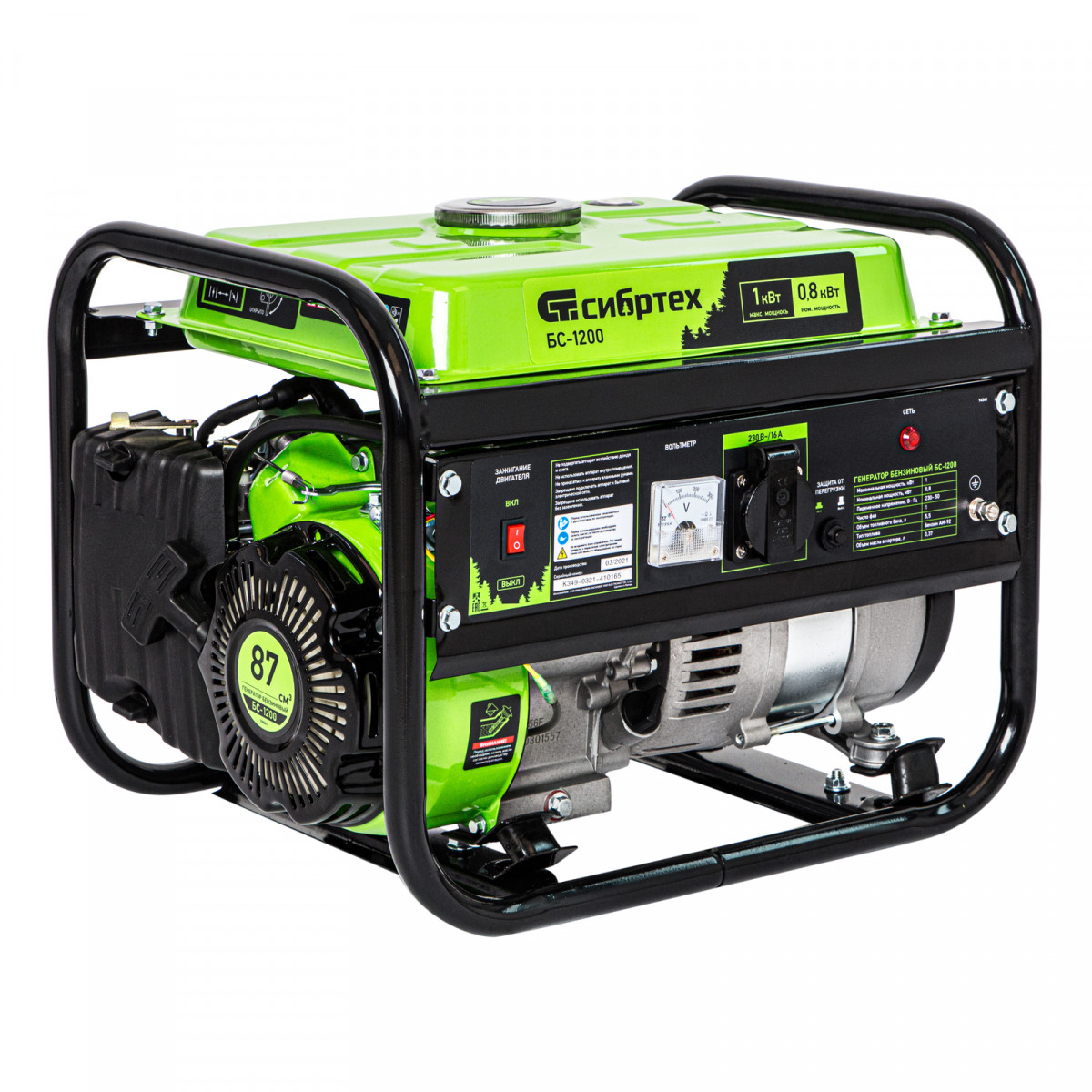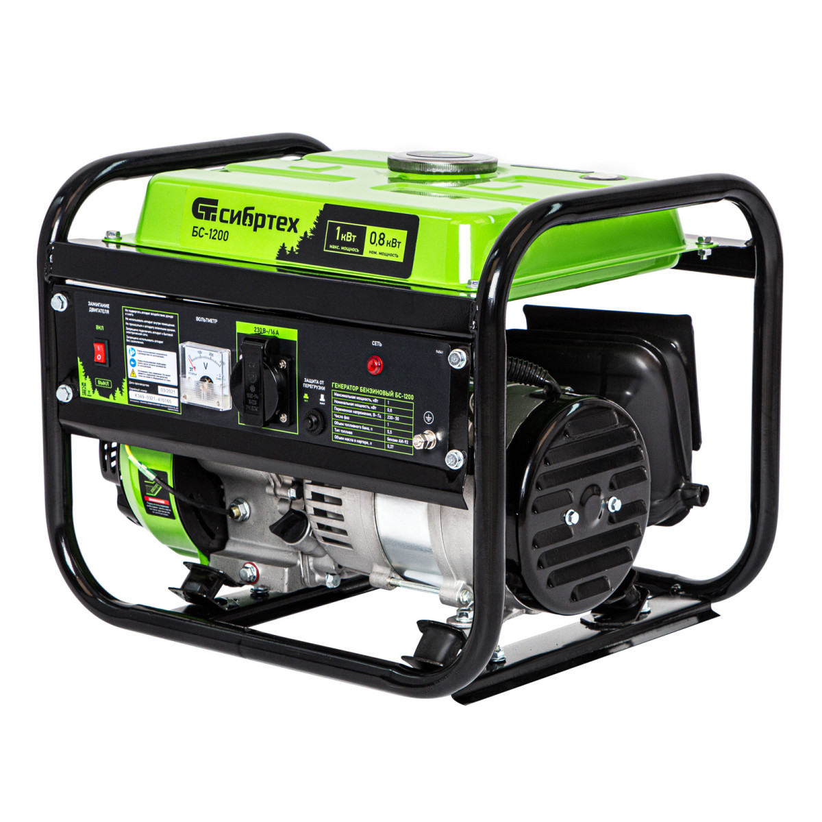 Бензиновый генератор Сибртех БС-1200 94541 на 230 В, максимальной мощностью 1 кВт, с 4-тактным двигателем, с баком на 5,5 л и ручным стартером, может использоваться в качестве простой резервной системы электроснабжения на природе, в мастерской или на даче. Вырабатываемой мощности в 800 Вт хватит для одновременного обеспечения электричеством 4 ламп накаливания, компьютера и роутера. Также возможно подключение одного инструмента с высоким пусковым током (не превышающим 1000 Вт), такого как дрель, перфоратор, углошлифовальная машина.