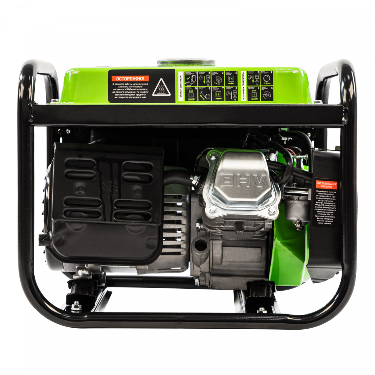 • Прочная конструкция — стальная рама защищает генератор от повреждений, а ее верхние элементы можно использовать как ручки для транспортировки.