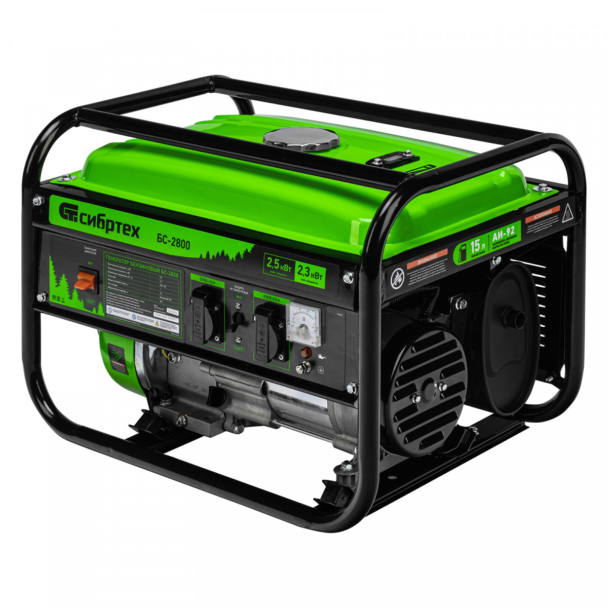 Бензиновый генератор Сибртех БС-2800 94543 на 230 В, максимальной мощностью 2,5 кВт, с 4-тактным двигателем и баком объемом 15 л, подходит для использования на даче, в гараже, мастерской или на стройке. Небольшой вес 37,6 кг позволяет брать генератор с собой на выездные работы или на природу. Мощности 2,5 кВт достаточно для одновременного питания 2 ламп накаливания, холодильника, СВЧ-печи и телевизора. 2 розетки упрощают одновременное подключение нескольких приборов.