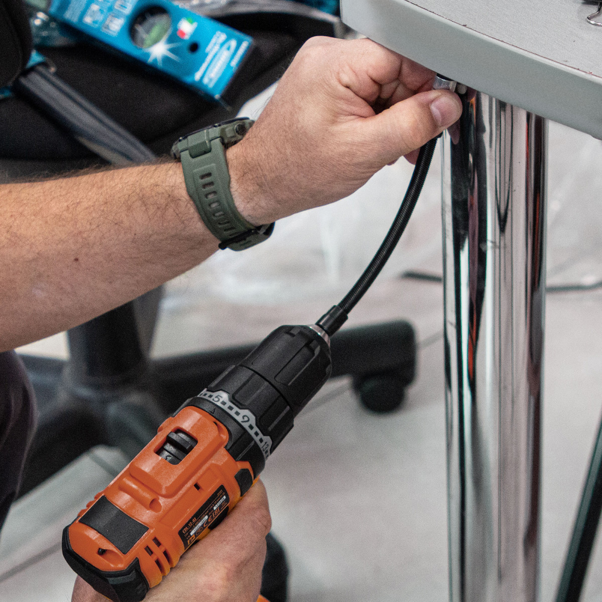 • Гибкий стержень — переходник позволяет получить доступ к участкам, расположенным под углом к оси вращения патрона шуруповерта.