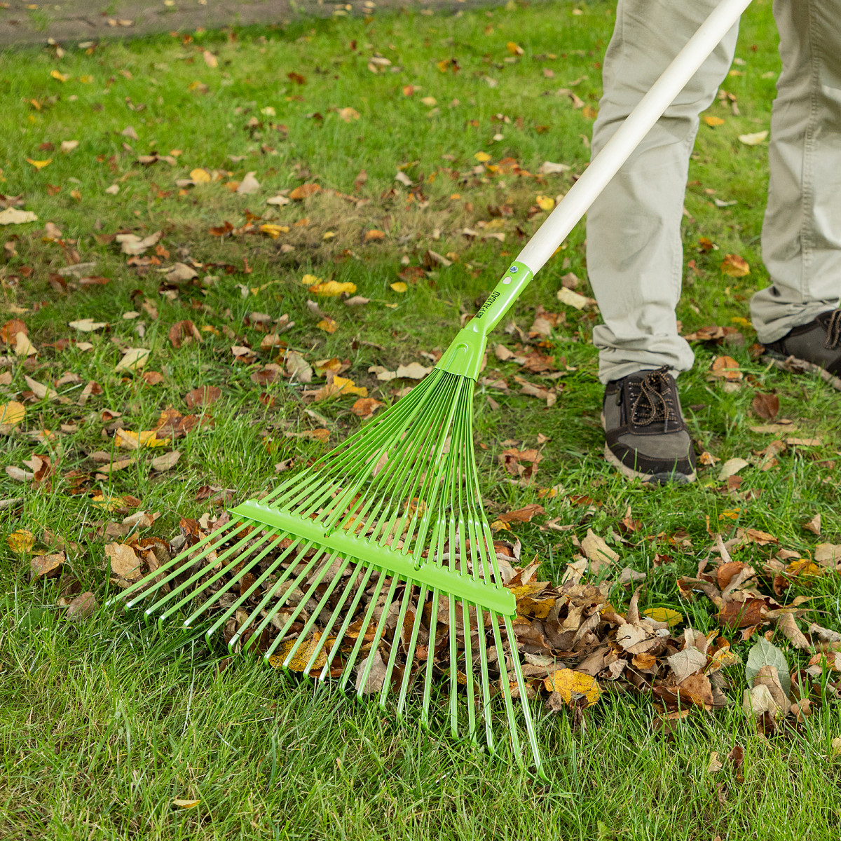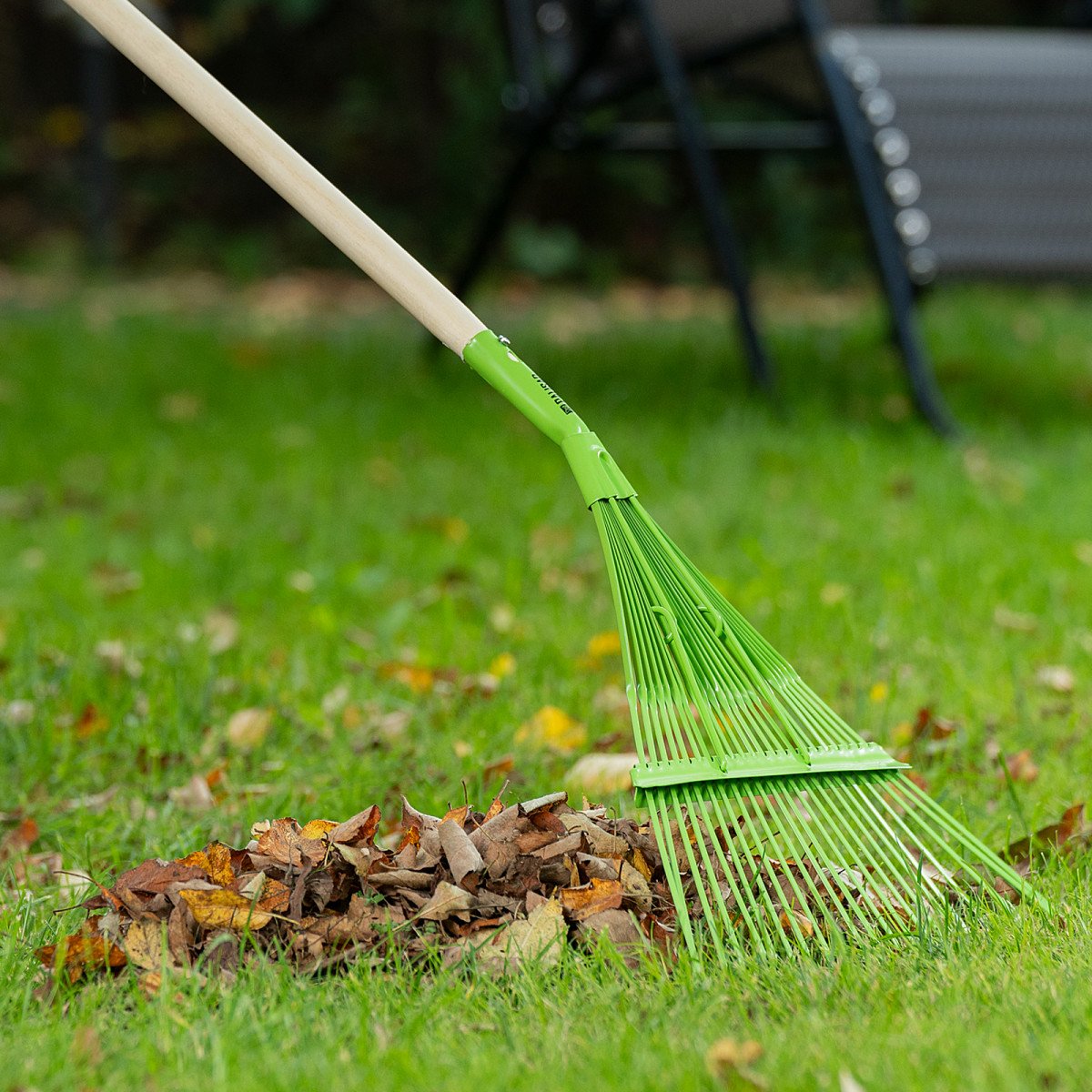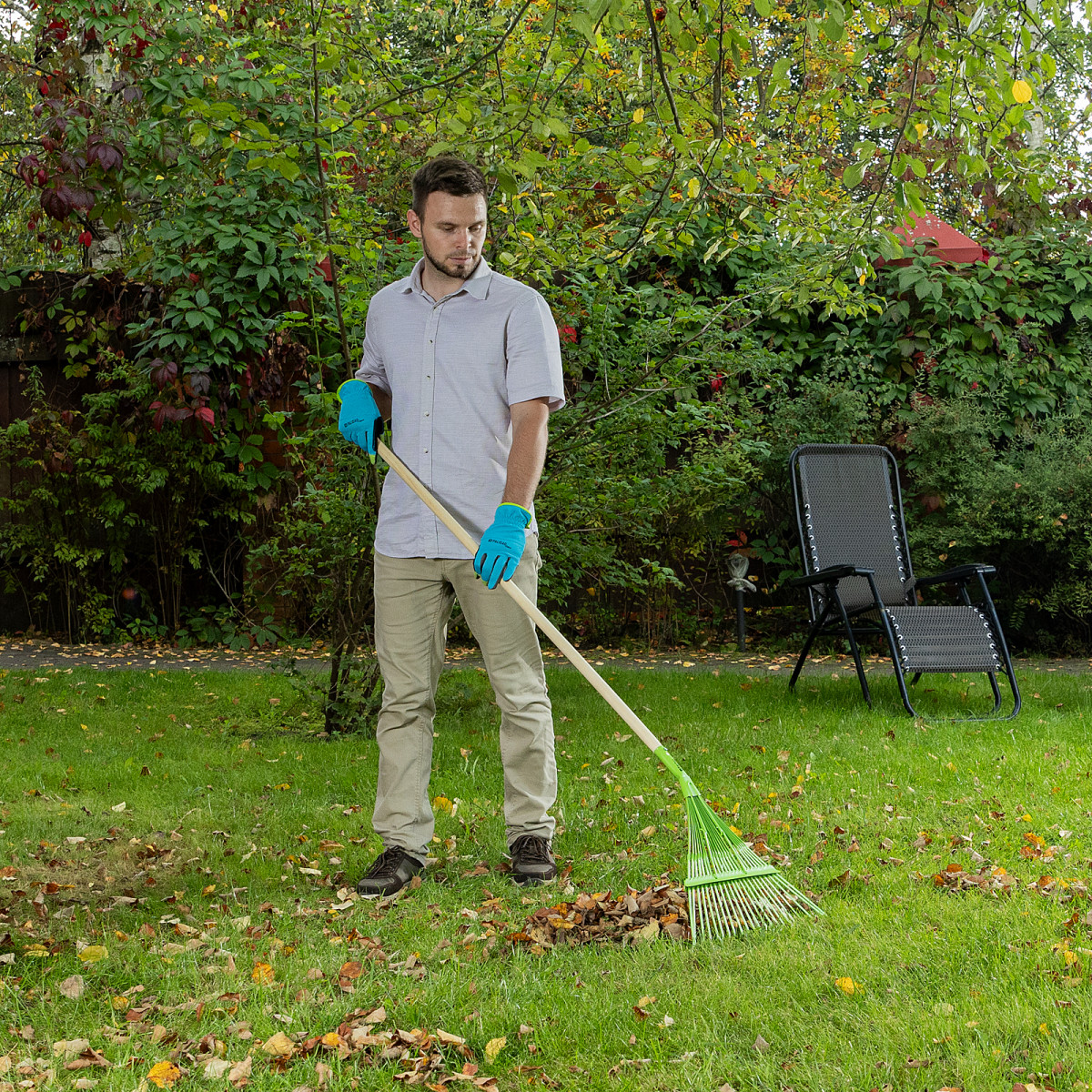 - Прочность и долговечность — грабли изготовлены из среднеуглеродистой стали и покрыты порошковой эмалью для защиты от коррозии.