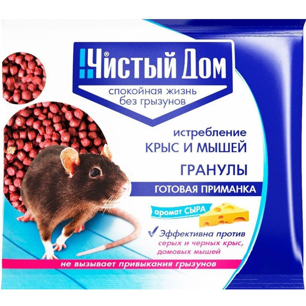 Гранулы от грызунов «Чистый Дом» — это пищевая отравленная приманка, в состав которой входят натуральные продукты, действующее вещество и специальные добавки. Для привлечения к приманке грызунов используется аромат сыра.