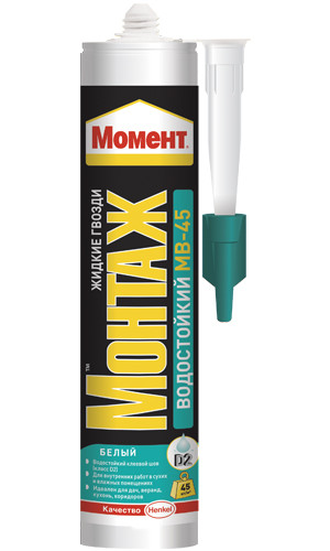 Первый монтажный клей на основе водной дисперсии, который обладает классом водостойкости D2. Клеевой шов выдерживает кратковременное воздействие влаги. Применяется при склеивании материалов из различных пород дерева, МДФ, ДСП, гипсокартона, пробки и пенополистирола. Предназначен для внутренних работ как в сухих, так и влажных помещениях: на даче, кухне, веранде и т.д. Не имеет запаха. Не содержит органических растворителей и не разрушает склеиваемые поверхности.