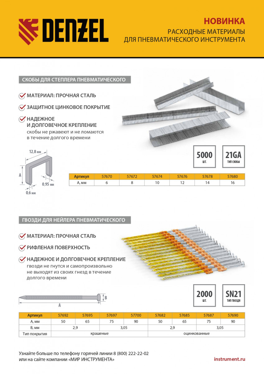 Гвозди Denzel 57692 типа SN21, длиной 50 мм и диаметром 2,9 мм, с крашеной поверхностью, 2000 шт. в упаковке, — расходники для пневматического нейлера. Используются для скрепления различных материалов, будут полезны во время сборочных и отделочных работ.