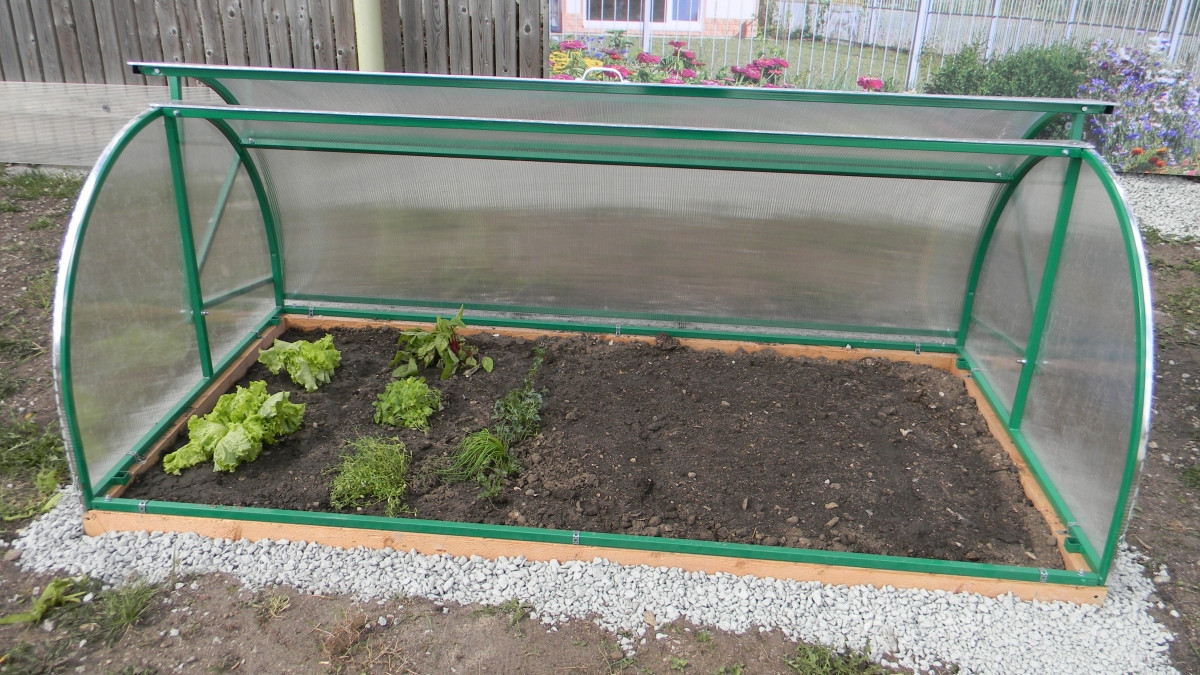 Оцинкованная профильная труба 20*20 мм, крабовое соединение, расстояние между дугами 1 метр . РАЗМЕРЫ: 1,4 м *2 м *0,9 м. Упаковка: в стрейч-пленку или в картонные коробки Особенности: возможность установки с оцинкованной грядкой и без использование СПК). Преимущества: нулевая нагрузка на снег за счет открывающейся крыши на зиму, возможность открытия полностью и небольшое проветривание. Поликарбонат приобретается отдельно!