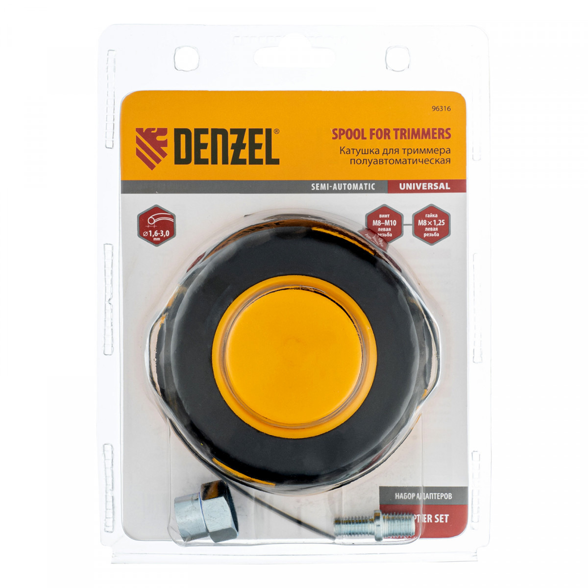 Универсальная триммерная катушка Denzel 96316 комплектуется адаптерами (гайка М10 х 1,25, гайка М8, винт М8-М10, левая резьба), поэтому совместима практически с любым электрическим и бензиновым триммером Denzel, оснащенным присоединительным винтом или гайкой. Также подходит к электро- и бензокосам от других производителей. Заправляется леской диаметром до 2,4 мм и позволяет решать большое количество задач: уход за газоном, скашивание сорняков, молодой поросли малины, старой и слежавшейся травы.
