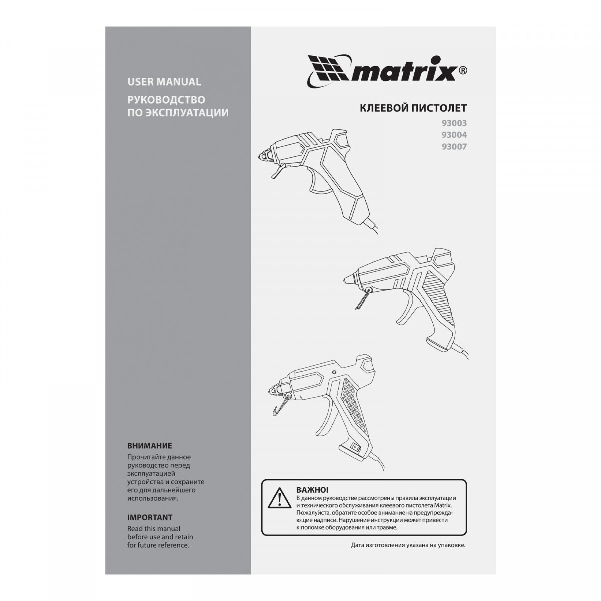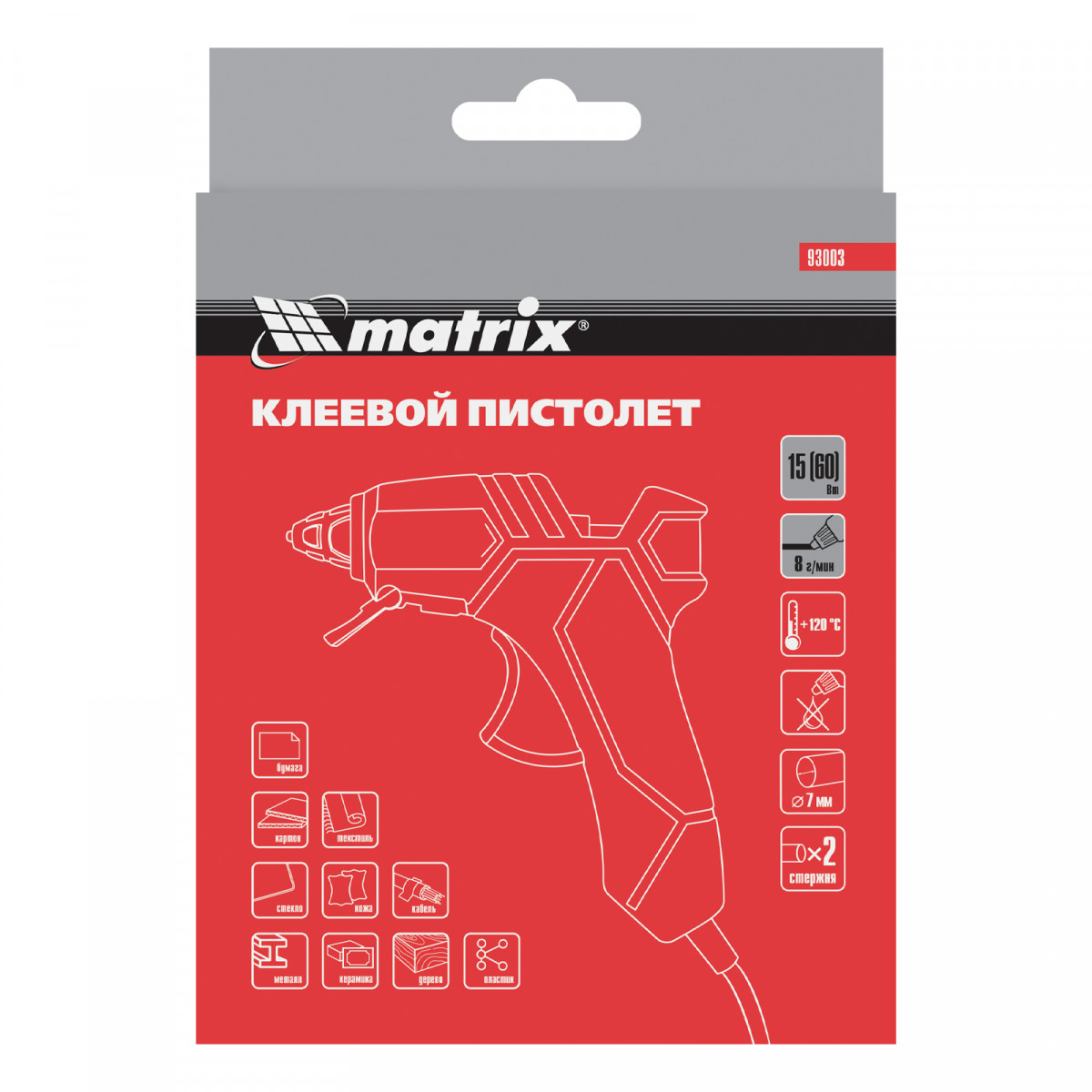 Клеевой пистолет Matrix 93003 потребляет мощность до 60 Вт, расходует 8 г клея в минуту и совместим со стержнями диаметром 7 мм. Позволяет склеивать бумагу, картон, текстиль, кожу, пластик и другие материалы. Время нагрева до рабочей температуры 120 °C — не более 4 минут, что позволяет быстрее приступить к работе. Инструмент используется для бытовых и полупрофессиональных нужд: выполнения мелкого ремонта, упаковки товаров, фиксации деталей, изготовления игрушек и объемных украшений, декорирования и т.д. Инструмент пригодится отделочникам, моделистам и тем, кто занимается хенд-мейдом.