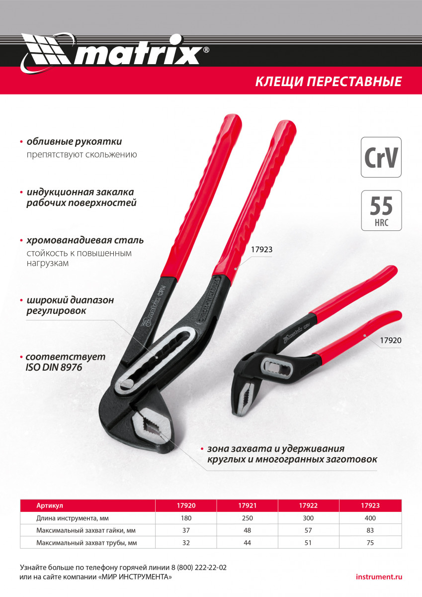 Переставные клещи Matrix 17922 длиной 300 мм, выполненные из хромованадиевой стали, с обливными рукоятками, используются для проведения монтажных и слесарных работ. Универсальный инструмент заменяет ключи различных размеров и применяется для фиксации заготовок, откручивания гаек, зажима и удержания труб диаметром до 51 мм.