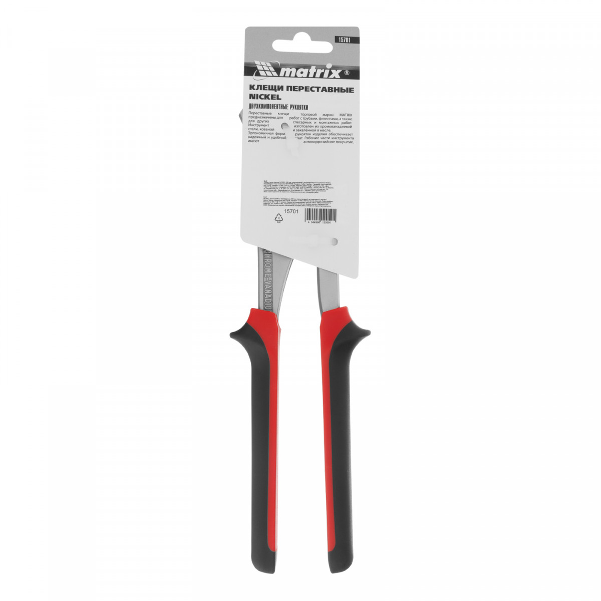 Переставные клещи Matrix Nickel 15701 длиной 250 мм, с покрытием белого цвета, выполненные из хром-ванадия, с двухкомпонентными рукоятками, используются для проведения монтажных и слесарных работ. Универсальный инструмент заменяет ключи различных размеров и применяется для фиксации заготовок, откручивания гаек, зажима и удержания труб и деталей.