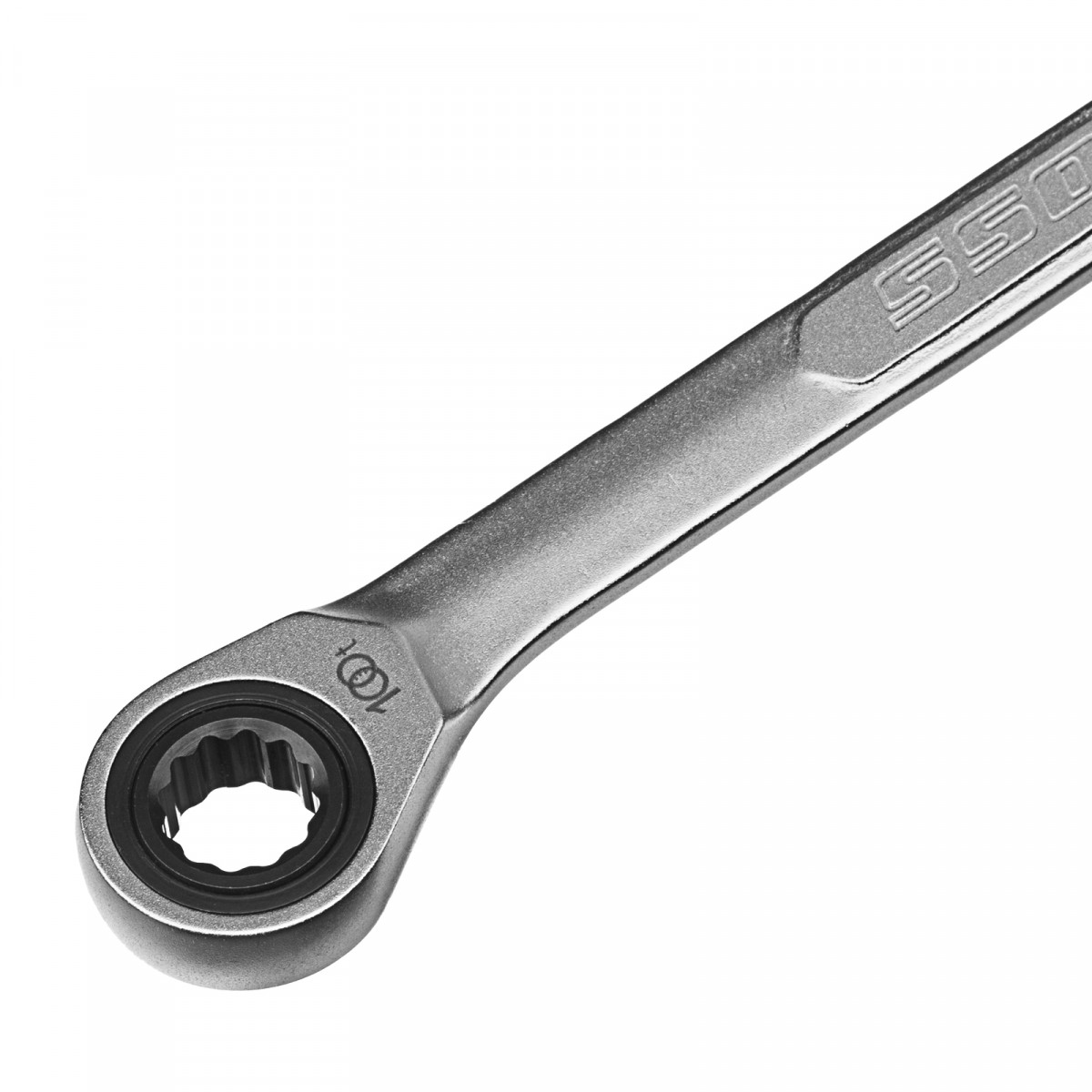 Комбинированный трещоточный ключ Gross 14847, 9 мм, используется при монтаже и демонтаже резьбовых соединений. Инструмент имеет как рожковую, так и накидную часть, что повышает его функциональность. У накидной части 12 внутренних граней, что увеличивает площадь соприкосновения с головкой крепежа и снижает риск ее деформации. Ключ применяется как в автосервисах, так и для самостоятельного ремонта автомобилей.