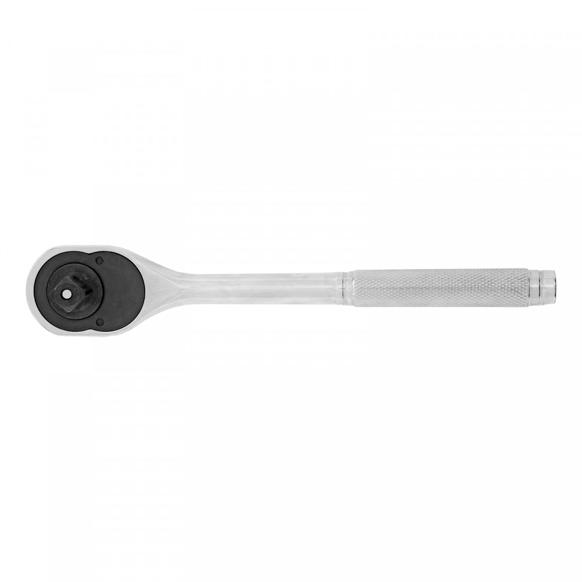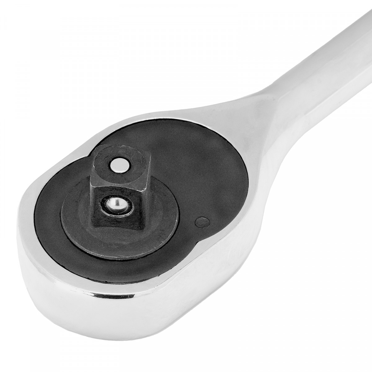 Цельнометаллический хромированный ключ-трещотка Сибртех 14019 из стали CrV, с посадочным размером 1/2″ и 45-зубым храповым механизмом, с функцией быстрого сброса, используется для монтажа и демонтажа резьбовых соединений. Предназначен для установки торцевых головок, адаптеров и удлинителей. Цельнометаллическая конструкция отличается повышенной прочностью, что позволяет работать со значительным усилием. Инструмент пригодится дома, в гараже и в поездке.