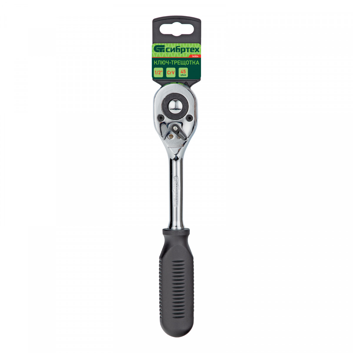 Хромированный ключ-трещотка Сибртех 14004 из стали CrV с посадочным размером 1/2″ и 45-зубым храповым механизмом, с функцией быстрого сброса, используется для работы с резьбовым крепежом. Инструмент пригодится дома, в мастерской и гараже.