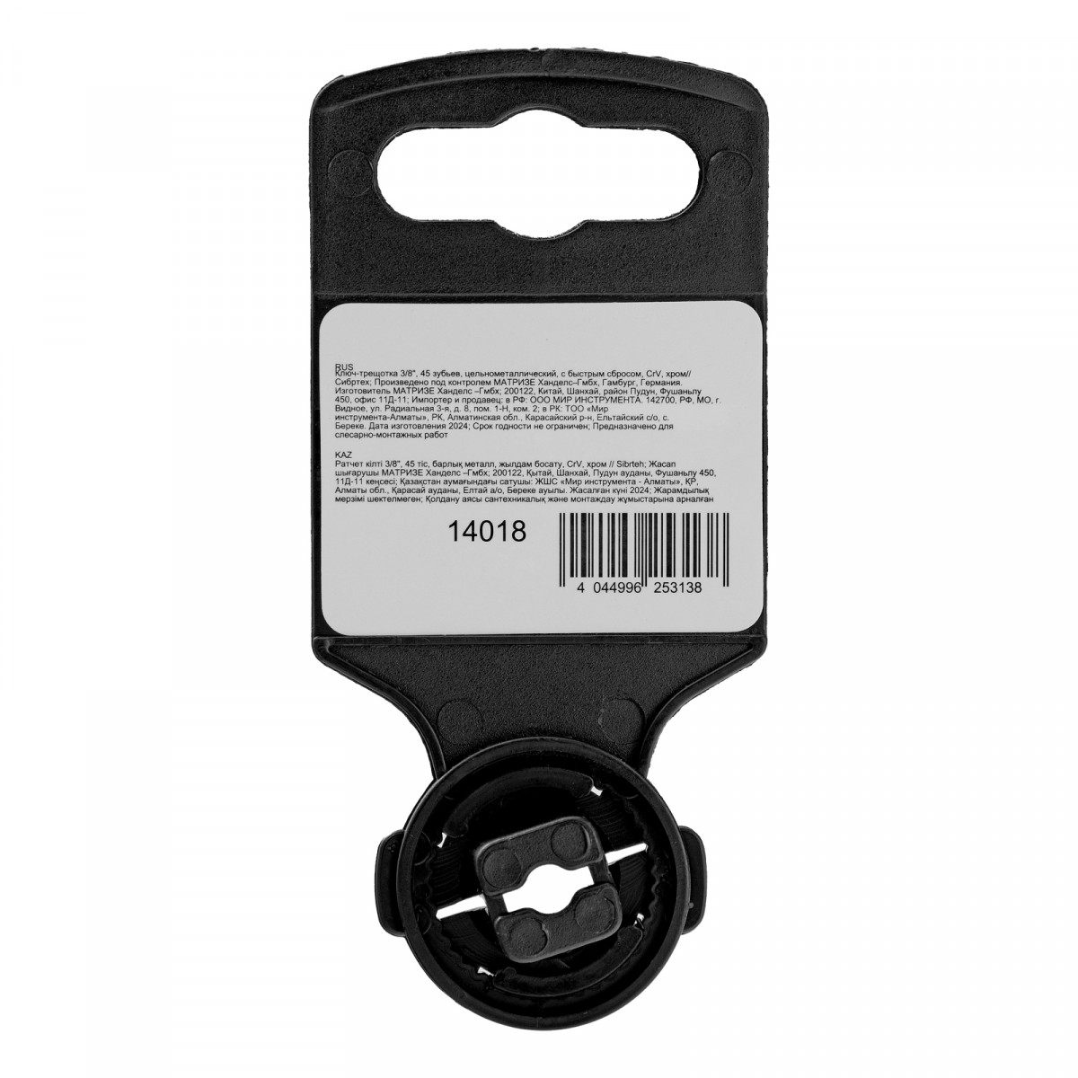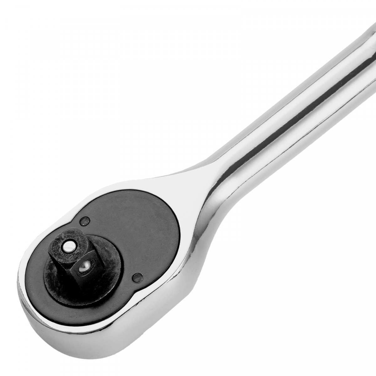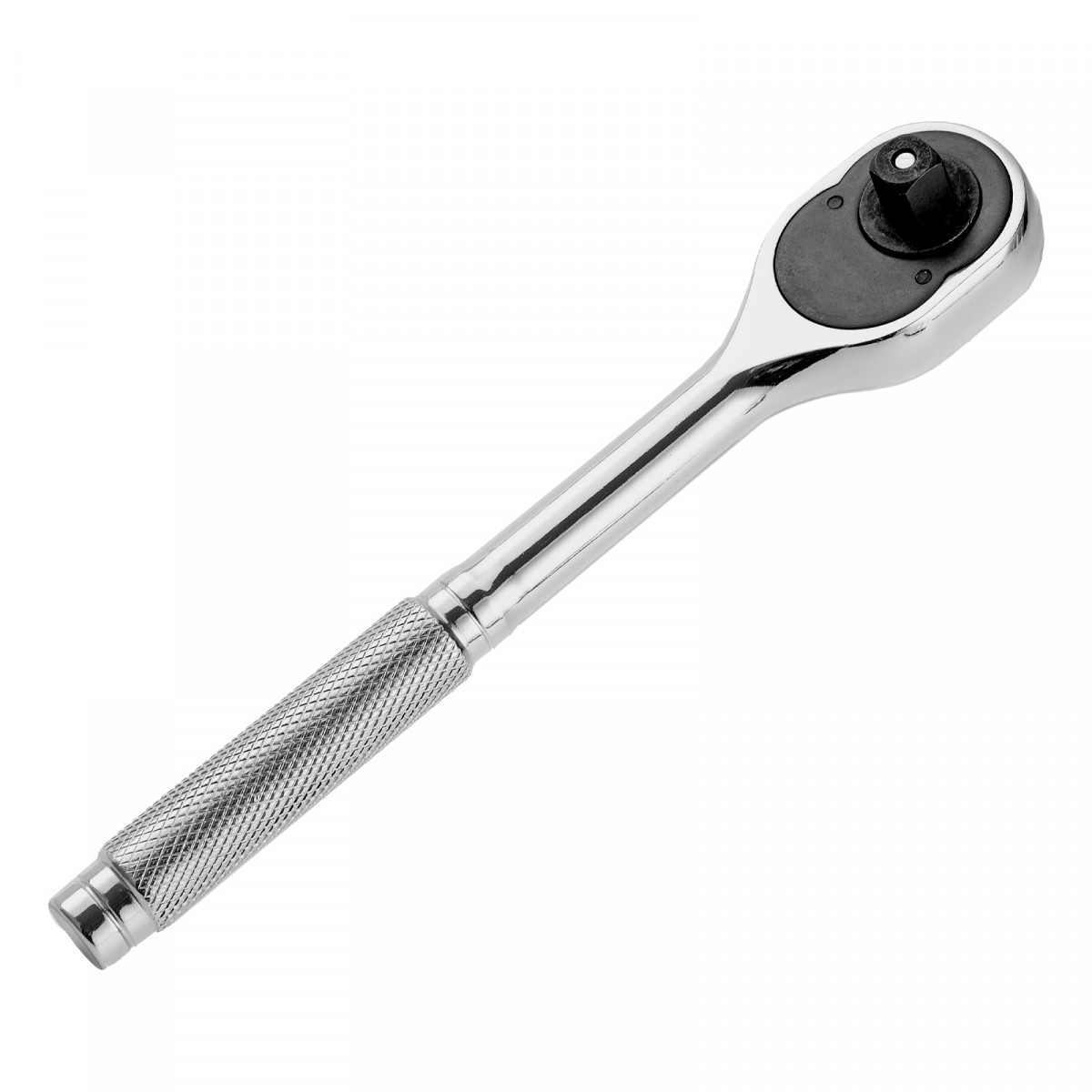 Цельнометаллический хромированный ключ-трещотка Сибртех 14018 из стали CrV, с посадочным размером 3/8″ и 45-зубым храповым механизмом, с функцией быстрого сброса, используется для монтажа и демонтажа резьбовых соединений. Предназначен для установки торцевых головок, адаптеров и удлинителей. Цельнометаллическая конструкция отличается повышенной прочностью, что позволяет работать со значительным усилием. Инструмент пригодится дома, в гараже и в поездке.