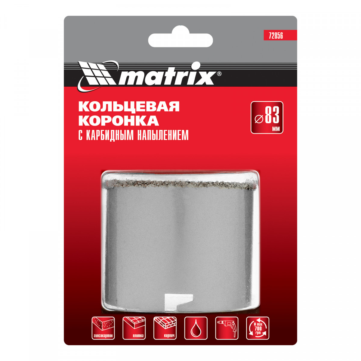 Кольцевая коронка с карбидным напылением Matrix 72856 диаметром 83 мм — сменный режущий элемент для дрелей и перфораторов. Предназначена для сверления отверстий в керамической плитке, ячеистом бетоне, пенобетоне, газосиликате, кирпиче. Пригодится для монтажа проводки в доме. Используется совместно с державкой Matrix 72860 и центрирующим сверлом Matrix 72862 (не входят в комплект поставки).